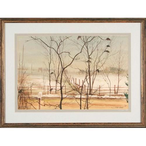 It shows a beautiful rural scene with a rustic wood fence. Several trees dot the composition. Birds are painted whimsically in the painting. The work is framed is a wood sage green frame with a cIt shows a beautiful rural scene with a rustic wood fence. Several trees dot the composition. Birds are painted whimsically in the painting. The work is framed is a wood sage green frame with a cream mat ream mat