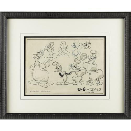 <B>"The Woody Woodpecker Polka" Model Sheet Animation Art (Walter Lantz Productions, 1951).</B></I> Woody disguises himself as a femme fatale in order to crash a barnyard dance and make off with all the food, in Lantz's 1951 short, "The Woody Woodpecker Polka." This wacky model sheet features Woody and Wally Walrus, and has an image area measuring 12" x 9". There is some light paper tanning, and light creasing; otherwise the condition is Very Good. Matted and framed. <BR><BR><B>Important notice:</B> Heritage usually auctions material at the rate of 200-250 lots per hour. On some occasions eBay Live bid software or the Internet may not be able to keep up with the pace of the auction. We recommend placing a realistic absentee bid now as insurance to avoid disappointment. Occasionally the auctioneer may eliminate or reject an eBay Live bid, and the auctioneer may also reopen a lot after the close of the eBay live bidding (usually because we missed an audience bid), and may reject your bid even if it shows you as the winning bidder. By bidding via eBay Live, you agree that Heritage may award the lot to another bidder at its sole discretion under the circumstances described above or any other reasonable circumstances. Since eBay bids are not shown to us until we open the lot on the floor, we treat those bids just like floor bids. In most cases the floor responds before the eBay bid is presented to us, due to Internet lag time, so for consistency we have made it a policy that floor bids are always considered first over tie eBay live bids. Also please note that all Heritage lots purchased through eBay Live carry a 22.5% Buyer's Premium. Please make sure you read the Terms and Conditions before you bid. This lot is being auctioned in conjunction with a live floor auction by Heritage Auction Galleries. All final auction and invoice information will be supplied by Heritage Auction Galleries, and all other information should be considered preliminary. Lot:41001 <BR><BR><B>Winning Notification and Billing:</B> After the FINAL session in this auction is complete, Heritage will send e-mail and snail mail invoices. This process normally takes several days. All final auction and invoice information will be supplied by Heritage Auction Galleries, and all other information should be considered preliminary. <BR><BR>This auction will be conducted on a live auction floor and over the Internet through eBay Live. If you choose to place an absentee bid, please take a moment to <font color='#0000ff'><u><a href='http://pages.ebay.com/liveauctions/help/before/laabsentee.html'>learn how eBay Live absentee bidding works</a></u></font><font color='#000000'>
