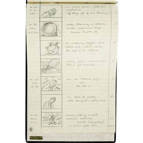 <B>"The Woody Woodpecker Show - Halloween Party" Script (Walter Lantz Productions, 1964).</B></I> Walter Lantz and an animated Woody prepare for a "Halloween Party," in this special Halloween episode of "The Woody Woodpecker Show." This hand-drawn script, illuminated with drawings, consists of thirteen pages of note paper, bound in a beautiful leather presentation portfolio. Measures 9" x 13.5". In Very Good condition, and signed by Walter Lantz. <BR><BR><B>Important notice:</B> Heritage usually auctions material at the rate of 200-250 lots per hour. On some occasions eBay Live bid software or the Internet may not be able to keep up with the pace of the auction. We recommend placing a realistic absentee bid now as insurance to avoid disappointment. Occasionally the auctioneer may eliminate or reject an eBay Live bid, and the auctioneer may also reopen a lot after the close of the eBay live bidding (usually because we missed an audience bid), and may reject your bid even if it shows you as the winning bidder. By bidding via eBay Live, you agree that Heritage may award the lot to another bidder at its sole discretion under the circumstances described above or any other reasonable circumstances. Since eBay bids are not shown to us until we open the lot on the floor, we treat those bids just like floor bids. In most cases the floor responds before the eBay bid is presented to us, due to Internet lag time, so for consistency we have made it a policy that floor bids are always considered first over tie eBay live bids. Also please note that all Heritage lots purchased through eBay Live carry a 22.5% Buyer's Premium. Please make sure you read the Terms and Conditions before you bid. This lot is being auctioned in conjunction with a live floor auction by Heritage Auction Galleries. All final auction and invoice information will be supplied by Heritage Auction Galleries, and all other information should be considered preliminary. Lot:41001 <BR><BR><B>Winning Notification and Billing:</B> After the FINAL session in this auction is complete, Heritage will send e-mail and snail mail invoices. This process normally takes several days. All final auction and invoice information will be supplied by Heritage Auction Galleries, and all other information should be considered preliminary. <BR><BR>This auction will be conducted on a live auction floor and over the Internet through eBay Live. If you choose to place an absentee bid, please take a moment to <font color='#0000ff'><u><a href='http://pages.ebay.com/liveauctions/help/before/laabsentee.html'>learn how eBay Live absentee bidding works</a></u></font><font color='#000000'>