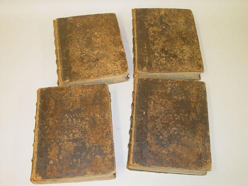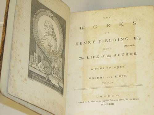 The Works of Henry Fielding, Esq; With the Life of the Author - in 4 Volumes. London: Printed for A. Millar, 1762. 4to - over 9¾" - 12" tall. Hard Cover. Ex-Library. Good condition. Complete in 4 Volumes. Vol. I - frontis, 49pp essay, 1 2pp, 623pp (which includes a Table of the Songs). Vol. II - title, 1 contents, 1 603pp. Vol. III - xxiv, 597pp. Vol. IV - xi, 3pp, 1 595pp. Bound in full leather, raised bands on spine, red & black spine labels, with gilt decorations, marbled page edges all around. BINDINGS TIGHT. Covers worn, some detached or loose, occasional foxing. THEATRE - LITERATURE.