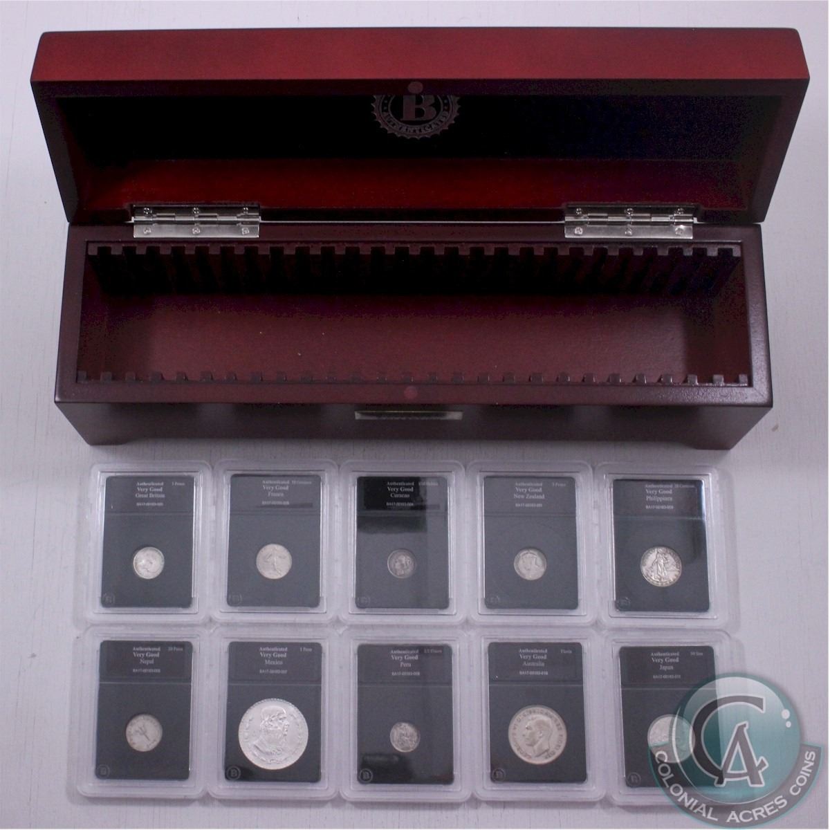 The World Silver Coin Collection issued by the Bradford mint. This set contains the following silver coins from around the world: 1904 Great Britain 3-pence,1906 Peru 1/2 Dinero, 1915 Philippines 20 Centavos, 1916 France 50 Centimes,1936 New Zealand 3 Pence, 1944 Curacao 1/10 Gulden,1951 Australia Florin, 1965 Mexico 1 Peso, 2009 Nepal 20 Paisa and a Japan 50 Sen. Each coin is individually encapsulated in a crystal-clear tamperproof holder that allows you to view both sides as well as a Stunning hardwood Deluxe Collector's Display Box with a rich mahogany stain and silver-finished title plaque and hinges.