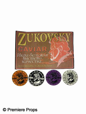 Four casino chips of various colors and one Zukovsky brand caviar label, screen used in the James Bond adventure The World is Not Enough (1999). Zukovsky, played by Robbie Coltrane, a former KGB enemy of Bond, owns a casino and assists 007 in his efforts to prevent global catastrophe. (Caviar Label 6x4, Chips 1.5" Diameter_