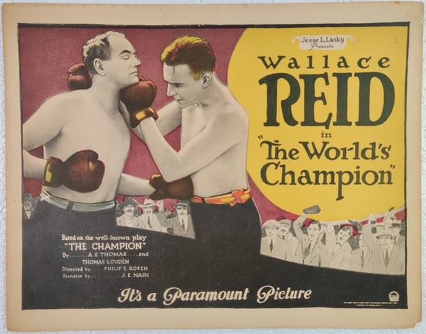 The World's Champion (Paramount Pictures, 1922) lobby card. Silent Film. Starring Wallace Reid, Lionel Belmore, Tiny Sandford, Kid McCoy, Lois Wilson. Directed by Phil Rosen. Some edge wear, light creases, small tears, pin-holes. Very Fine. (11"x14").