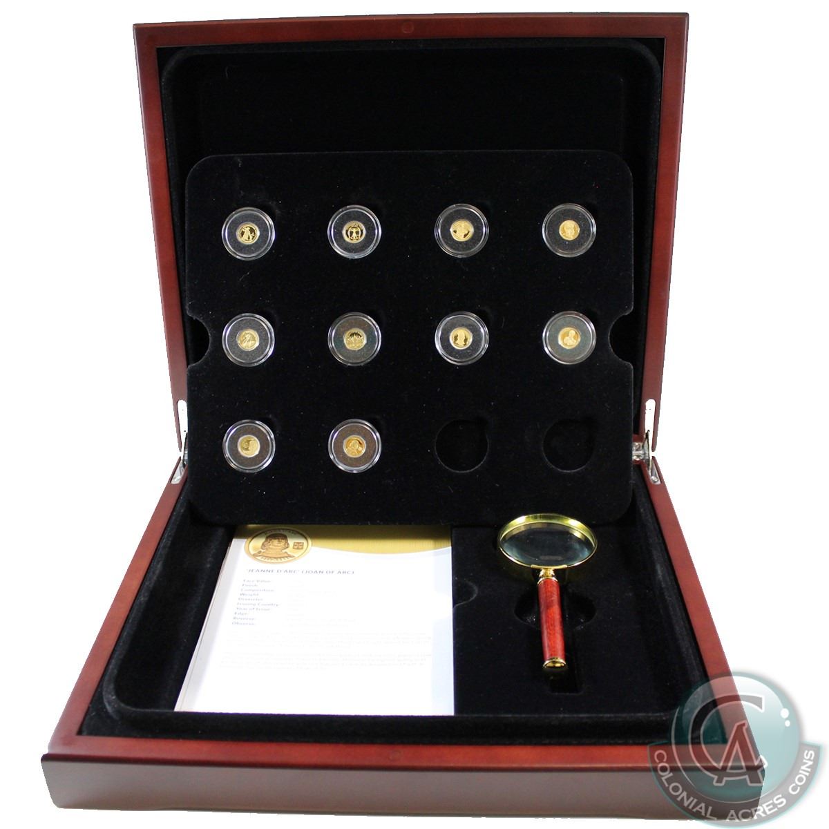The World's Smallest Gold 10-coin Collection issued by the RCM in Deluxe Display Box with Magnifying Glass & COAs. You will receive 10 out of 12 coins dated 2006-2012 including: Artemis, Leonardo Da Vinci, Santa Maria, Pallas Athene, Sputnik 1, St. Mark's Basilica, The Man with the Golden Helmet, Napoleon Bonaparte, Marie Curie & Joan of Arc. 10pcs (TAX Exempt)