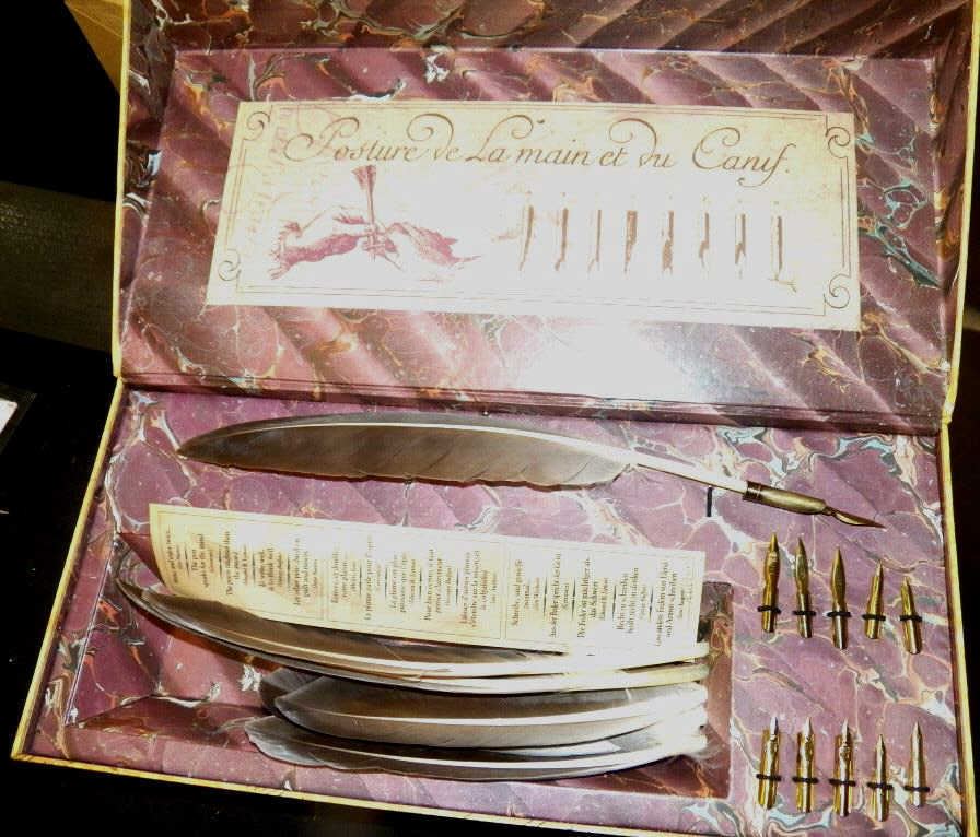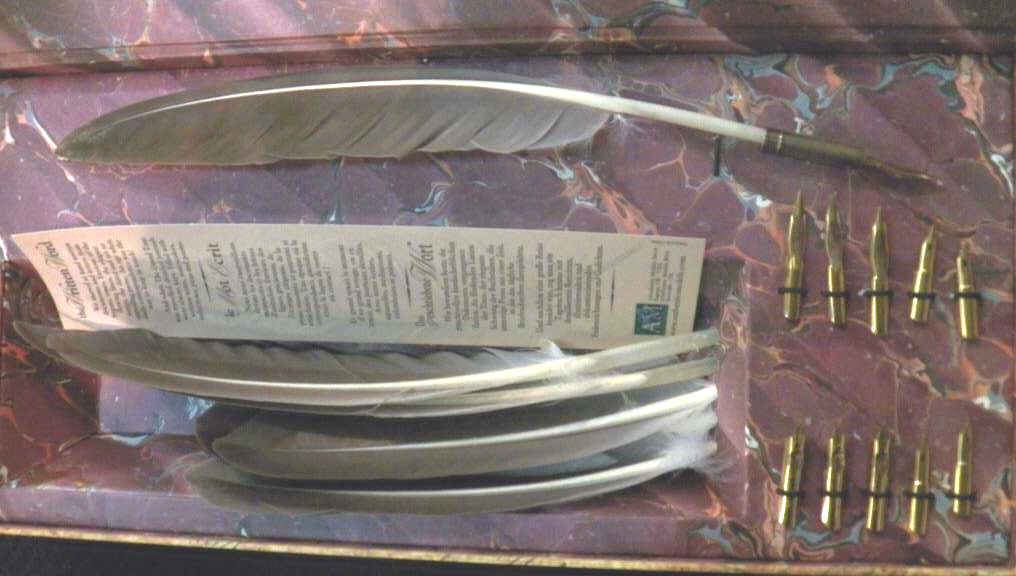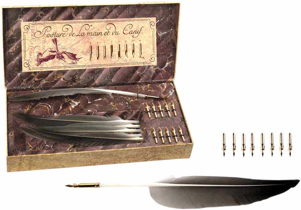 6 quills is an authentic replica of the quill pens used long ago. BEAUTIFUL!! and can be used today to reproduce the wonderful handwriting of yester year. The quills and pen nubs are in perfect condition.