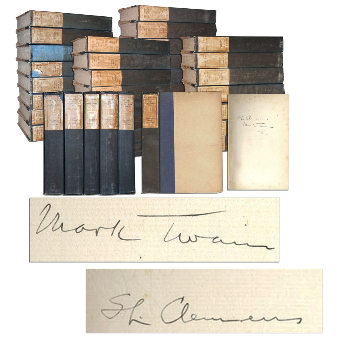 ''The Writings of Mark Twain'' 37 volume set, signed by America's foremost author in Volume 1. Gabriel Wells: New York: 1922-1925. This ''Definitive Edition'' set was announced in 1922 and marketed to wealthy collectors. Illustrated with photogravure frontis portraits and roughly 160 illustrations throughout the set. #198 of 1024 with a tipped-in leaf signed ''S.L. Clemens / Mark Twain'' in the first volume. Bound opposite sheet is additionally signed by Mark Twain's biographer Albert Bigelow Paine who wrote: ''The fly-leaf was signed by Mark Twain in 1906 in anticipation of the publication of this edition which did not appear until after his death.'' Octavo books are bound in paper and blue cloth spines with printed paper spine labels. Some discoloration to spines of each volume which almost all have dampstaining to front pastedown and free endpaper. Two volumes have missing labels on the spine, a few others have loose labels, and the binding is a little loose on the first signed volume. Overall very good, and a nearly-immaculate keepsake from America's most famous and accomplished writer. Signature page is near fine.