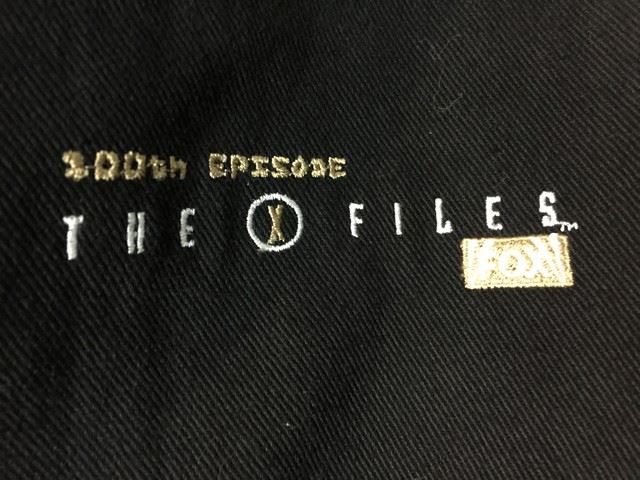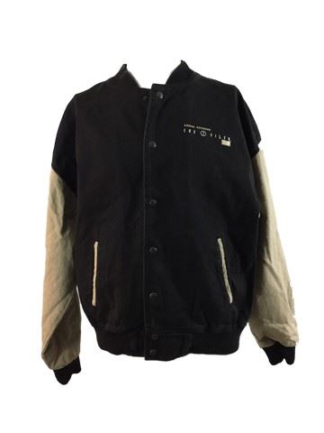 Black and tan varsity style jean crew jacket with "The X Files 100th episode" stitched and embroidered on left side.