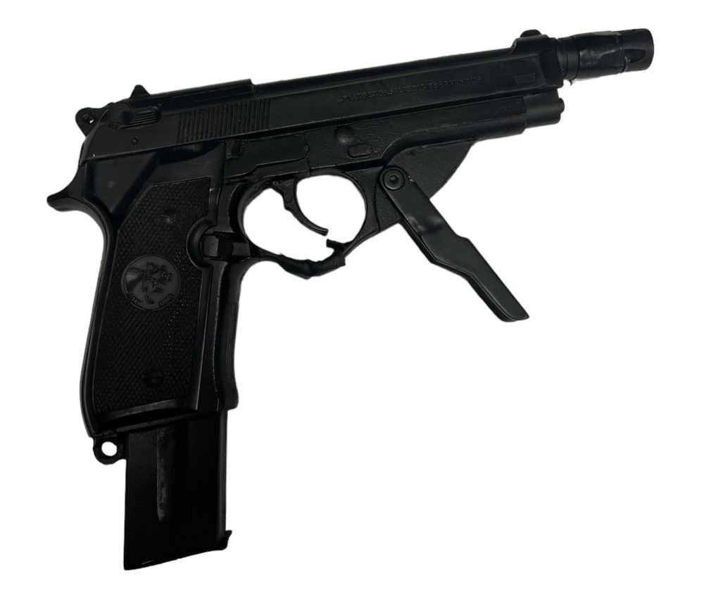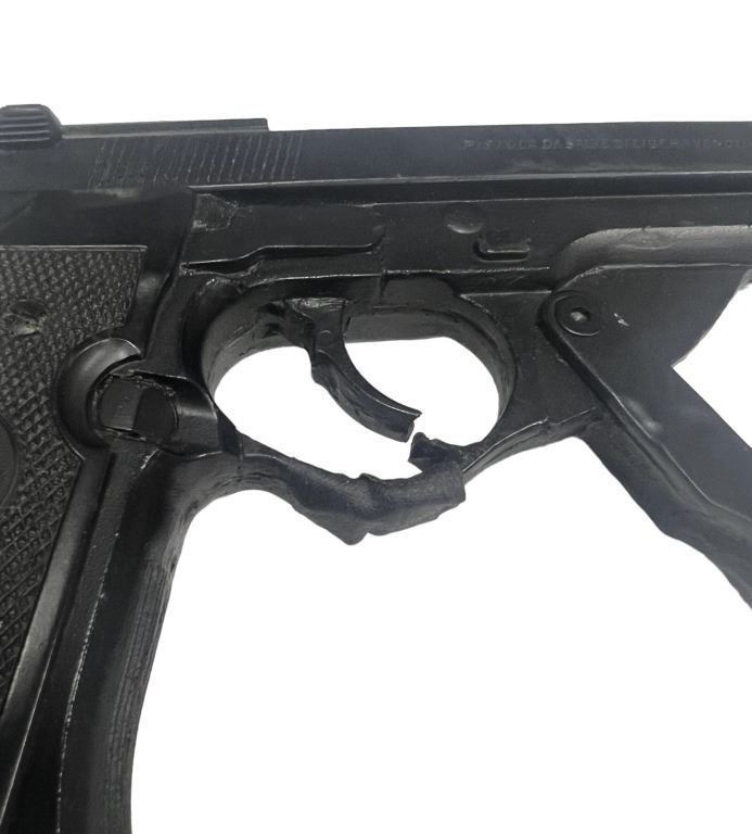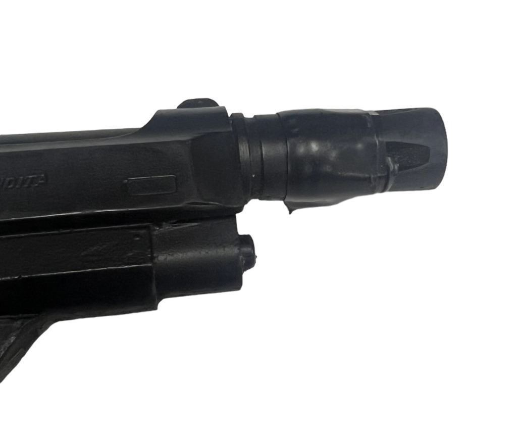 Made of rubber with black tape around mussel and black tape repairing the trigger guard.