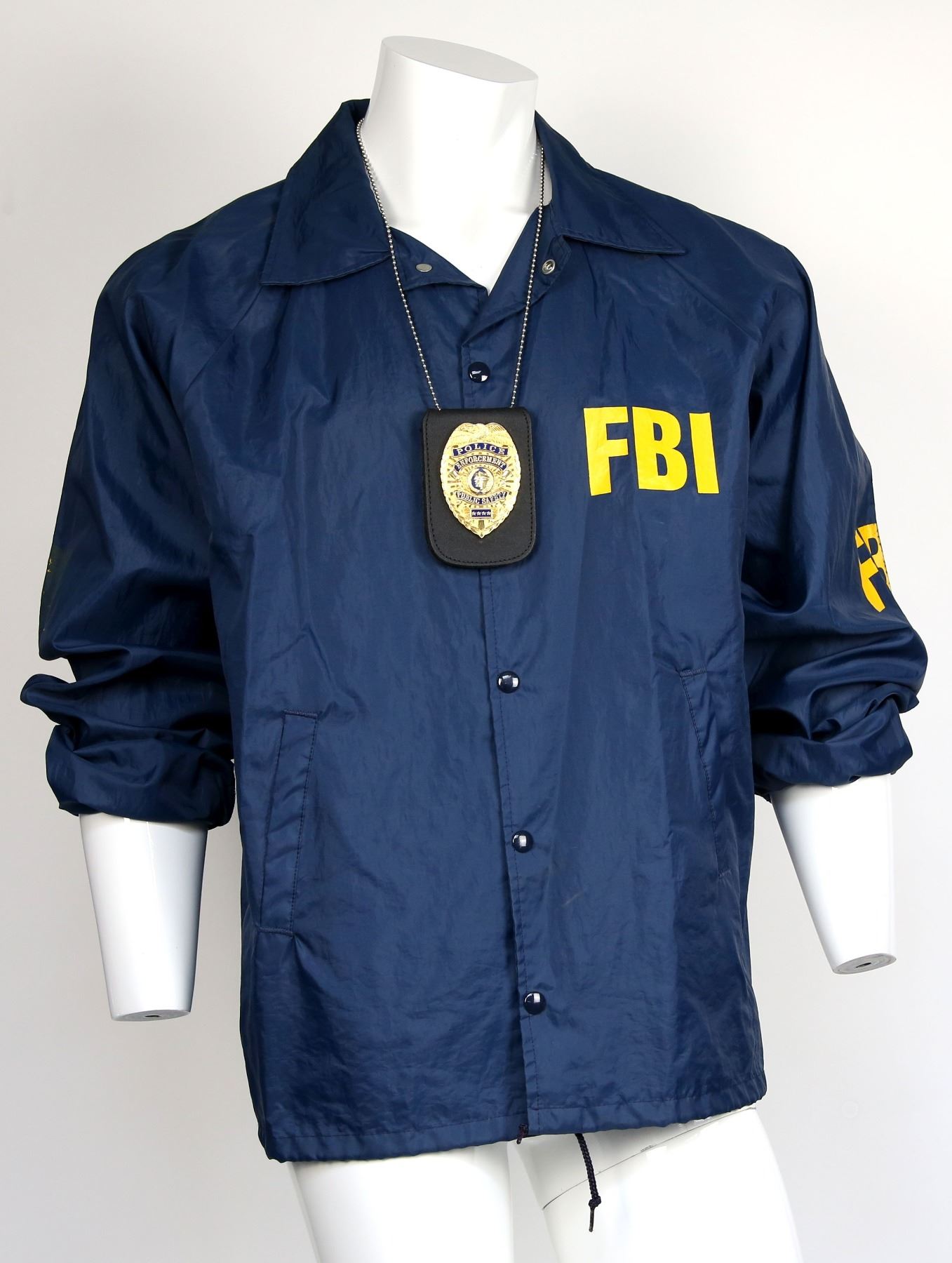 The X-Files - Navy blue FBI jacket together with Police badge and warrant card on neck chain. The jacket with manufacture labels and Western Costume inscriptions and barcode label (40219388) attached to inside.