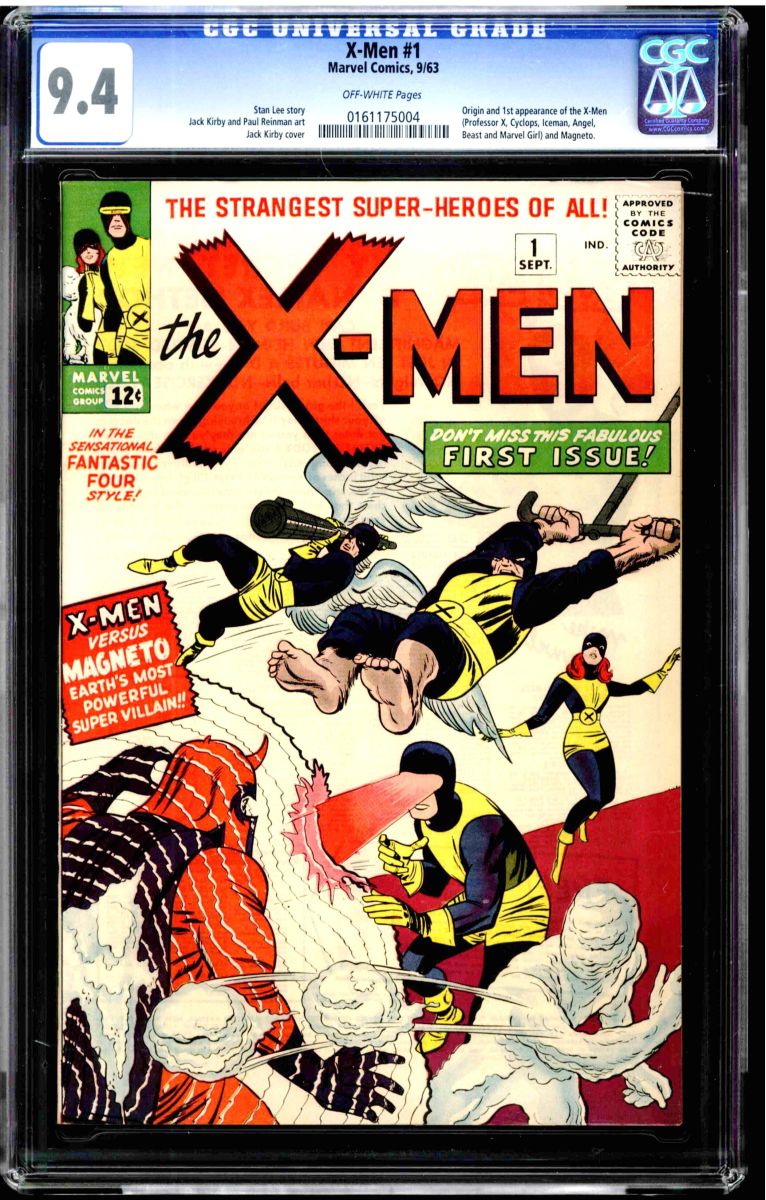 The X-Men #1 CGC 9.4 off white pages. Stan Lee story, Jack Kirby and Paul Reinman art, Jack Kirby cover. Origin and 1st appearance of the X-Men (Professor X, Cyclops, Iceman, Angle, Beast and Marvel Girl) and Magneto. This is a key silver age book, and remains one of Marvel's heaviest of hitters, spawning volumes of sequel series, spinoffs, cartoons, imitations, and a box office decimating movie franchise. Overstreet 2009 NM 9.2 value = $22,000. CGC census: 5 at 9.4, only 3 higher!