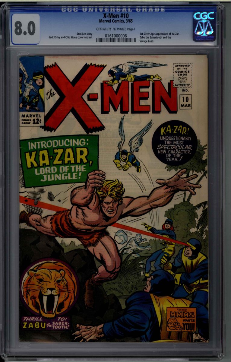 The X-Men #10 CGC 8.0 off-white to white pages. Stan Lee story, Jack Kirby and Chic Stone cover and art. 1st Silver Age appearance of Ka-Zar, Zabu the Sabertooth and the Savage Land. Overstreet 2009 VF 8.0 value = $302. CGC census: 56 in 8.0, 130 higher.