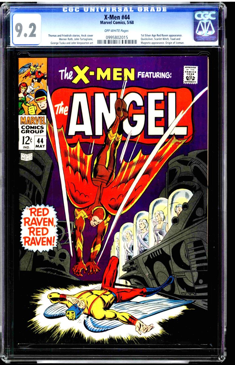 The X-Men #44 CGC 9.2 Off-White. Thomas and Friedrich stories Heck cover. Werner Roth John Tartaglione, George Tuska and John Verpoorten art. Quicksilver Scarlet Witch Toad and Magneto appearance. Origin of Iceman. 1st SA Red Raven appearance. Overstreet 2009 NM 9.2 value = $165. CGC census: 15 at 9.2, 31 higher.