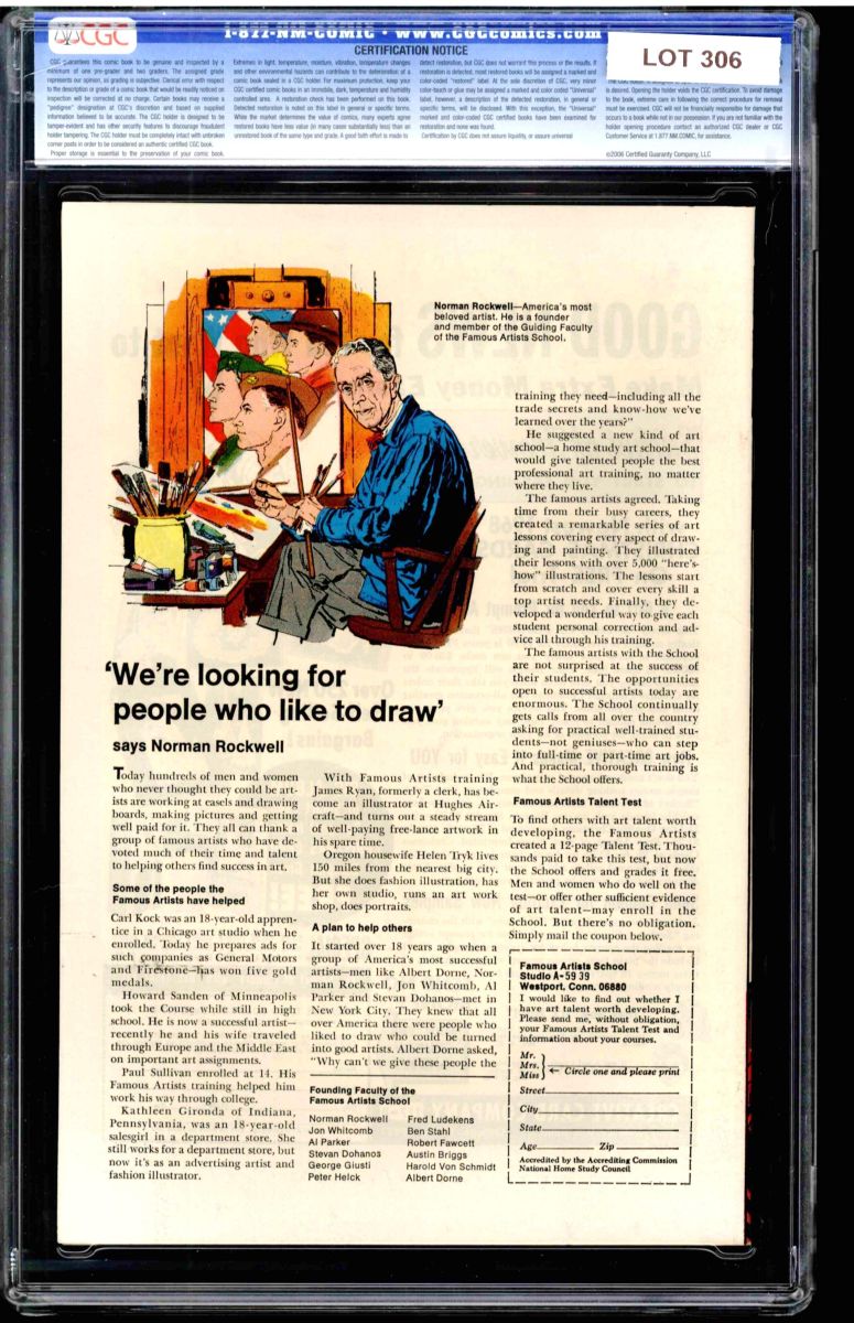 The Auctioneer has reserved the right to reject any and all bids, and to bid at the auction. Auctioneers Auctions are not on approval. Auctioneer does not allow certified material to be returned because of possible differences of opinion with respect to the grade offered by any third party organization, dealer, or service. Absolutely no guarantee of grade is offered for un-certified property sold and subsequently submitted to a third-party grading service. There will be no exceptions to this policy. Under extremely limited circumstances, (e.g. gross cataloging error) a purchaser, who did not bid from the floor, may request Auctioneer to evaluate voiding a sale; such request must be made in writing detailing the alleged gross error, and submission of the lot to the Auctioneer must be pre-approved by the Auctioneer. Bidder must notify Auctioneer in writing of such request within three (3) days of the non-floor bidder receipt of the lot. Any lot that is to be evaluated must be in our offices within 30 days after Auction. Grading does not qualify for this evaluation process nor do such complaints constitute a basis to challenge the authenticity of a lot. AFTER THAT 30-DAY PERIOD, NO LOTS MAY BE RETURNED FOR REASONS OTHER THAN AUTHENTICITY. Lots returned must be housed intact in the original holder. No lots purchased by floor Bidders may be returned (including those Bidders acting as agents for others). Late remittance for purchases may be considered just cause to revoke all return privileges. B: Auctions conducted solely on the Internet have a THREE (3) DAY RETURN POLICY: Lots paid for within seven days of the Auction closing are sold with a three (3) day return privilege. You may return lots under the following conditions: Within three days of receipt of the lot, you must first notify Auctioneer by contacting Client Service by phone (314-680-8599) or e-mail (moundcityauctions@gmail.com), and immediately mail the lot(s) fully insured to the attention of Returns, Mound City Auctions 1081 Teson Rd. Hazelwood, MO. 63042. Lots must be housed intact in their original holder and in their original condition. You are responsible for the insured, safe delivery of any lots. Auctioneer will not be responsible for lots returned in non-registered mail or lots returned without prior authorization per section B. A non-negotiable return fee of 5% of the purchase price ($10 per lot minimum) will be deducted from the refund for each returned lot or billed directly. Postage and handling fees are not refunded. After the three-day period (from receipt), no items may be returned for any reason. Late remittance for purchases revokes all Return-Restock privileges. C: Bidders who have inspected the lots prior to the auction will not be granted any return privileges. D: Comic books sold referencing a third-party grading service are sold “as is” without any express or implied warranty. Certain warranties may be available from the grading services and the Bidder is referred to them for further details: Certified Guaranty Company, LLC. (CGC), P.O. Box 4738, Sarasota, FL 34230. E: Bidders who intend to challenge authenticity or provenance of a lot must notify Auctioneer in writing within thirty (30) days of the Auctions conclusion. In the event Auctioneer cannot deliver the lot or subsequently it is established that the lot lacks title, provenance, authenticity, or other transfer or condition issue is claimed, Auctioneer's liability shall be limited to rescission of sale and refund of purchase price; in no case shall Auctioneer's maximum liability exceed the high bid on that lot, which bid shall be deemed for all purposes the value of the lot. After one year has elapsed, Auctioneer's maximum liability shall be limited to any commissions and fees Auctioneer earned on that lot. F: All comics are guaranteed genuine, but are not guaranteed as to grade, since grading is a matter of opinion, an art and not a science, and therefore the opinion rendered by the Auctioneer or any third party grading service may not agree with the opinion of others (including trained experts), and the same expert may not grade the same item with the same grade at two different times. G: Since we cannot examine encapsulated comics, they are sold “as is”without our grading opinion, and may not be returned for any reason. Auctioneer shall not be liable for any patent or latent defect or controversy pertaining to or arising from any encapsulated collectible. In any such instance, purchaser's remedy, if any, shall be solely against the service certifying the collectible. H: Due to changing grading standards over time, differing interpretations, and to possible mishandling of items by subsequent owners, Auctioneer reserves the right to grade items differently than shown on certificates from any grading service that accompany the items. Auctioneer also reserves the right to grade items differently than the grades shown in the prior catalog should such items be reconsigned to any future auction. I: Although consensus grading is employed by most grading services, it should be noted as aforesaid that grading is not an exact science. In fact, it is entirely possible that if a lot is broken out of a plastic holder and resubmitted to another grading service or even to the same service, the lot could come back with a different grade assigned. J: Certification does not guarantee protection against the normal risks associated with potentially volatile markets. The degree of liquidity for certified collectibles will vary according to general market conditions and the particular lot involved. For some lots there may be no active market at all at certain points in time."