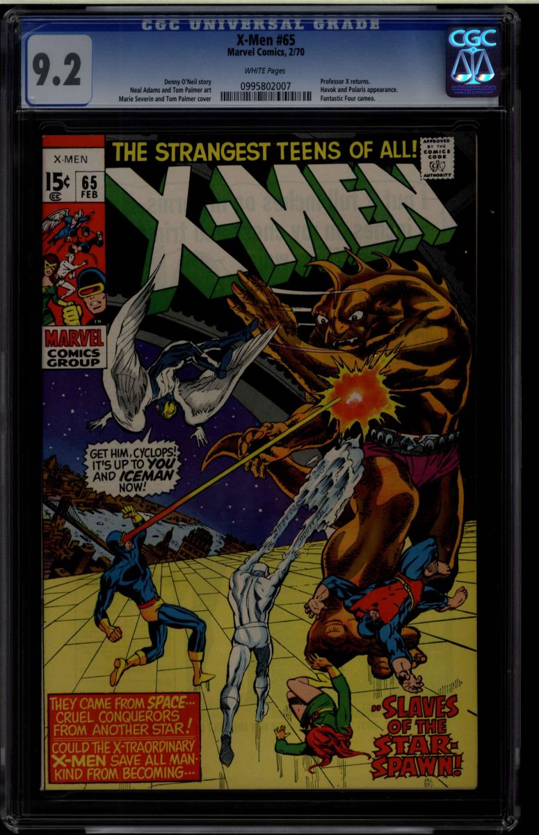 The X-Men #65 CGC 9.2 White. Denny O'Neil story. Neal Adams and Tom Palmer art. Marie Severin and Tom Palmer cover. Havok and Polaris appearance. Fantastic Four cameo. Professor X returns. Overstreet 2009 NM 9.2 value = $175. CGC census: 27 at 9.2, 44 higher.
