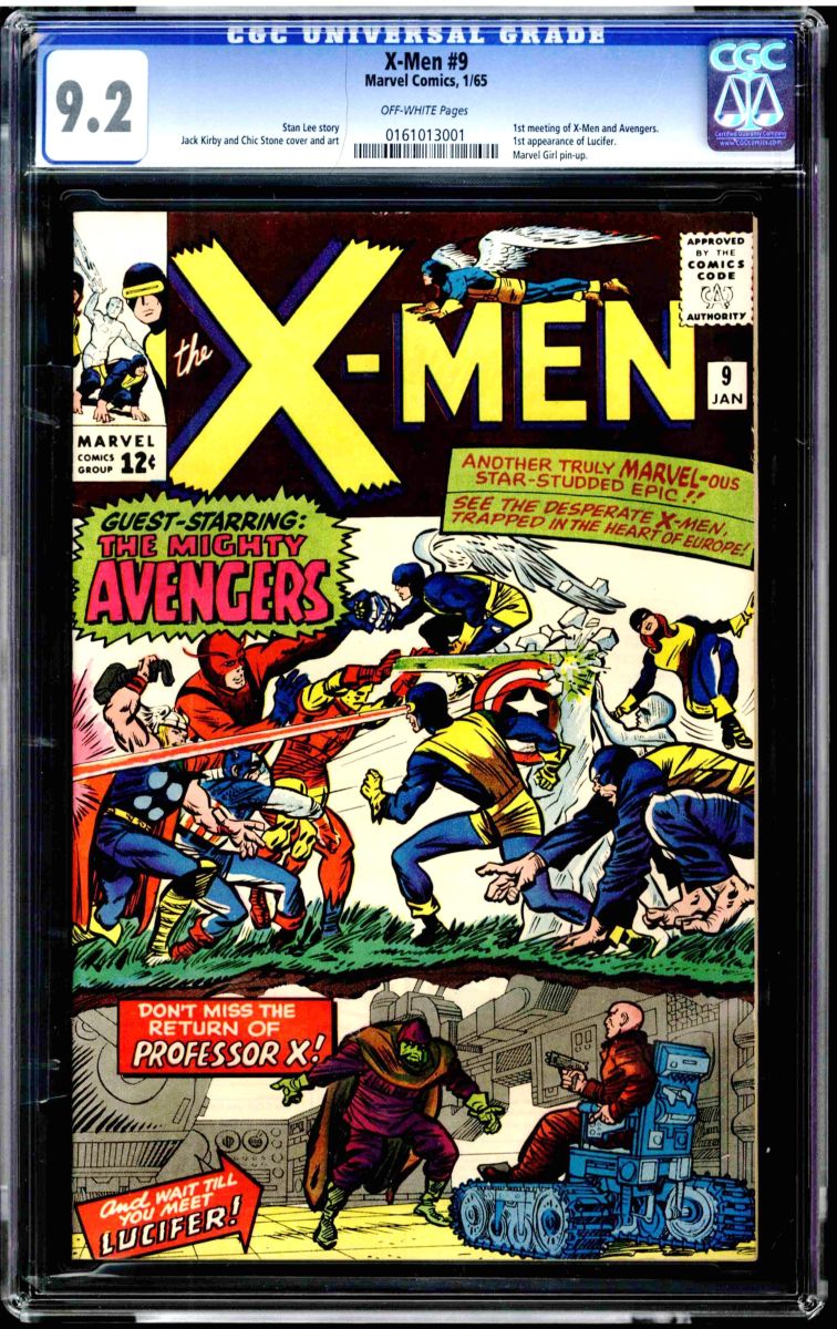 The X-Men #9 CGC 9.2 Off white pages. 1st meeting of the X-Men and the Avengers, 1st appearance of Lucifer. Marvel Girl pin-up. Overstreet 2009 NM 9.2 value = $875. CGC census: 19 at 9.2, 22 higher.