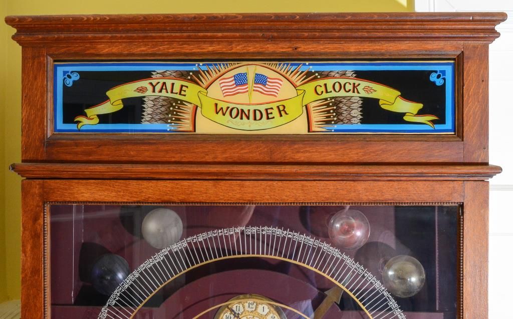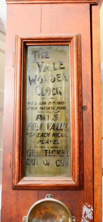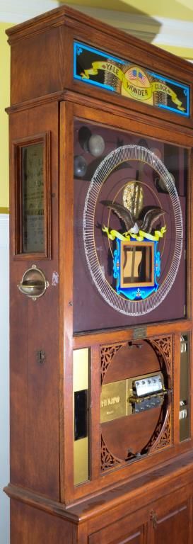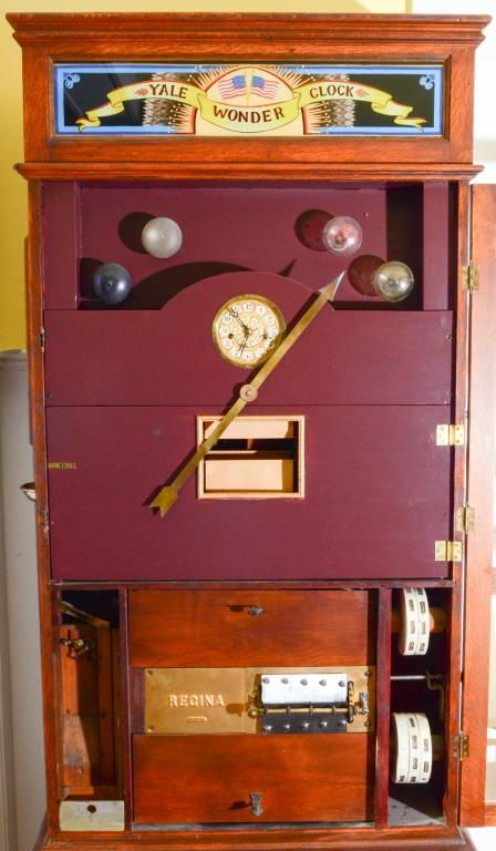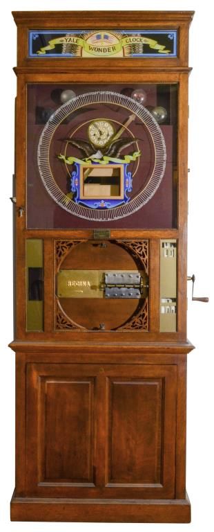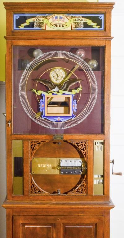 The Yale Wonder Clock, made in Burlington Vermont at the turn of the 20th century, is a coin operated mechanical marvel with its roulette type dial, spinning pointer, flashing lights, 15 1/2 " Regina music box , and token system which rewarded a lucky patron with merchandise from the store where the machine was displayed.
