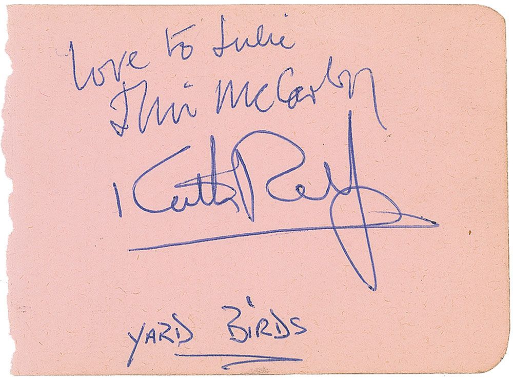 Vintage ballpoint signature and inscription, “Love to Julie, Jim McCarty,” and “Keith Relf,” adding the band’s name underneath, on a light pink 4 x 3 album page. In fine condition. Consignor notes that the signatures were obtained at London’s Heathrow Airport circa mid 1960s to mid 1970s.