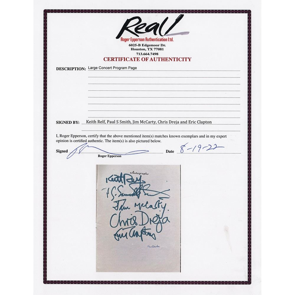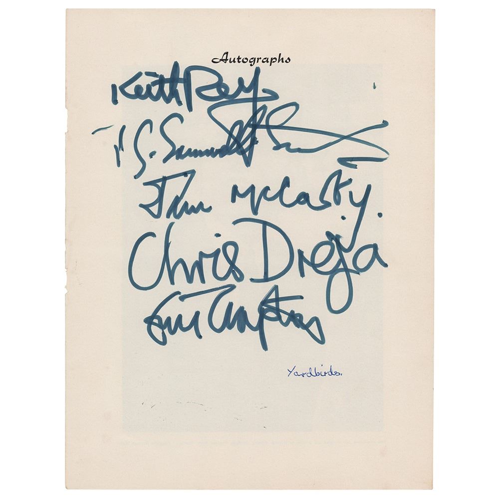 Vintage circa mid-1960s thick felt tip signatures of Eric Clapton, Keith Relf, Paul Samwell-Smith, Jim McCarty, and Chris Dreja on a slick off-white 8 x 10.5 program page. In fine condition, with light handling wear, and a central horizontal bend. Accompanied by a full letter of authenticity from REAL. Exceptionally large and bold autographs from the Yardbirds.
