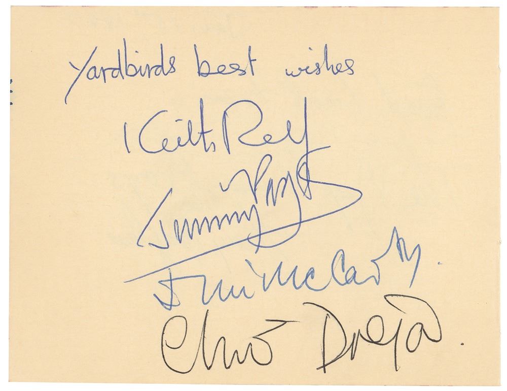 Desirable ballpoint signatures, "Yardbirds best wishes, Keith Relf," "Jimmy Page," "Jim McCarty," and "Chris Dreja," on an off-white 4.75 x 3.5 album page. In very fine condition.