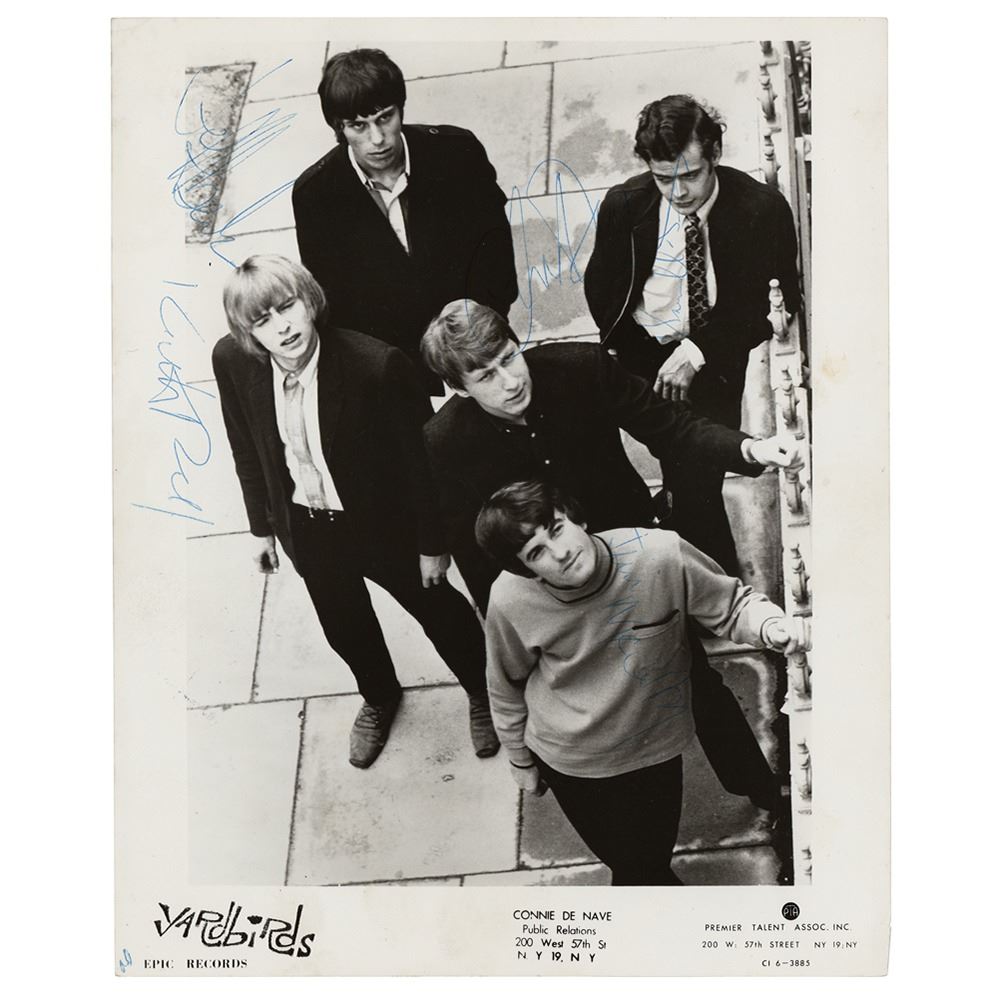 Vintage glossy 8 x 10 Epic Records publicity photo of the Yardbirds posing on a sidewalk, signed in blue ballpoint by Jeff Beck, Chris Dreja, Jim McCarty, Paul Samwell-Smith, and Keith Relf. In fine condition. Accompanied by two glossy unsigned photos of the band.