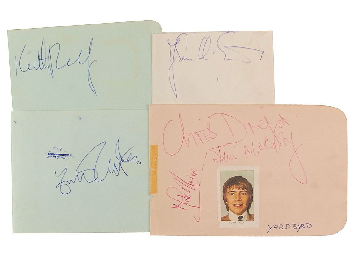 Vintage ballpoint signatures of Eric Clapton, Chris Dreja, Jim McCarty, Keith Relf, and Paul Samwell-Smith on individual colored album pages and slips. In overall very good condition.
