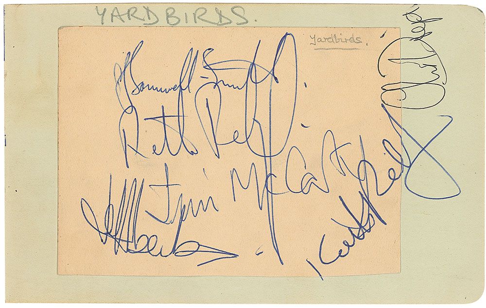 Vintage ballpoint signatures of Jim McCarty, Paul Samwell-Smith, Keith Relf (2), Chris Dreja, and Jeff Beck on an off-white 4.25 x 3 card affixed to a 6 x 4 light green album page, with a couple signatures extending on to the album page, which also bears a couple of collector’s pencil notations. In fine condition, with a few scattered light creases and some minor curling to vertical edges. Accompanied by a certificate of authenticity from Tracks.