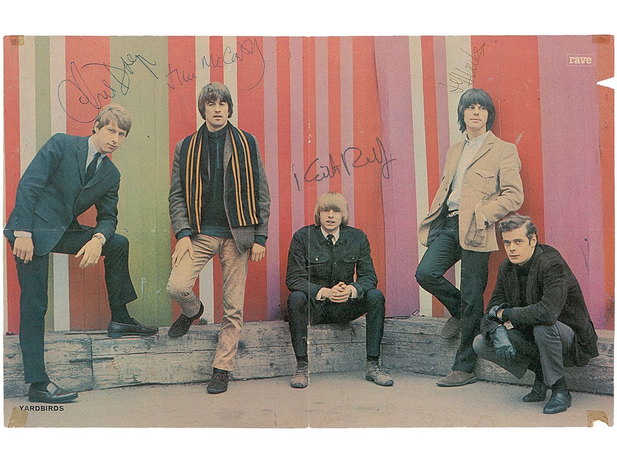 Color vintage 16.75 x 10.75 Rave magazine gatefold photo, signed in ballpoint and felt tip by Chris Dreja, Jim McCarty, Keith Relf, and Jeff Beck. In fine condition, with old tape remnants to corners, a couple small areas of paper loss to edges, staple holes to central vertical fold and light intersecting folds.