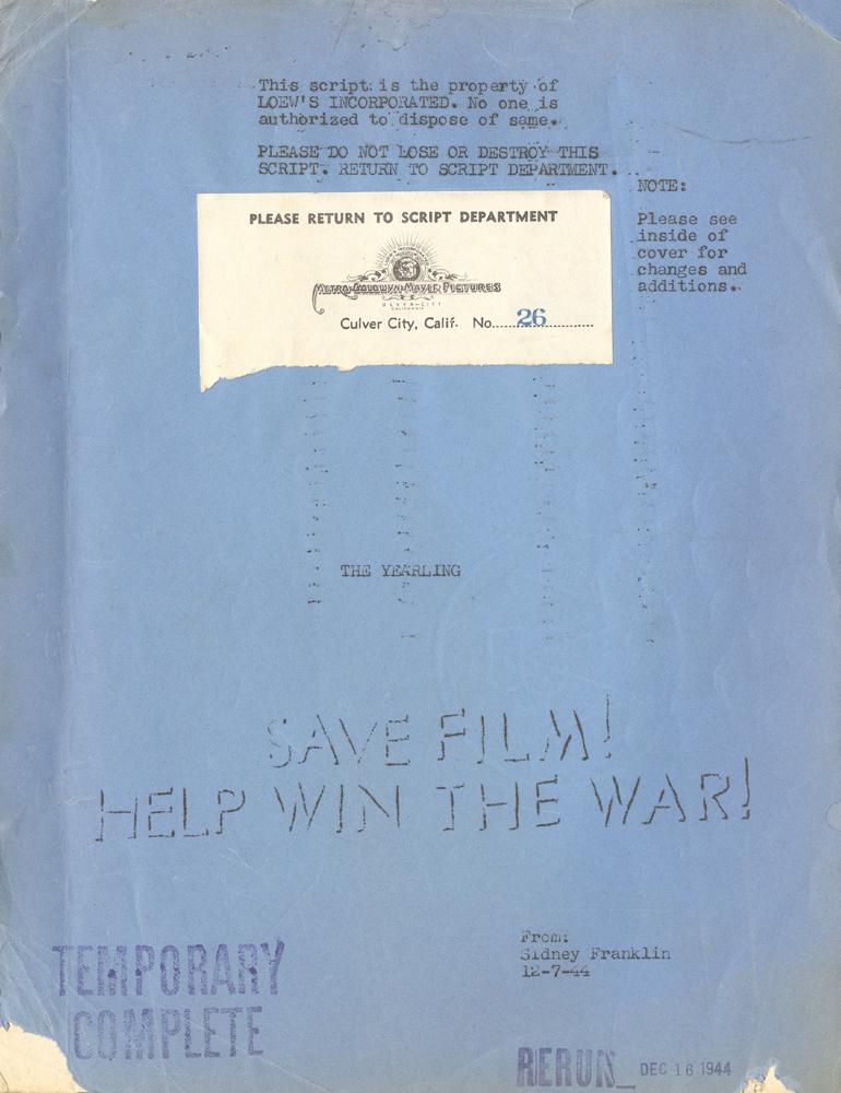 (MGM, 1946) Original studio mimeo “temporary/complete” early draft screenplay dated 12/7/1944 with various-dated revisions, 141 pp in printed covers, for the Clarence Brown directed film from Marjorie Kinnan Rawlings’ Pulitzer Prize-winning novel. Some chipping and dampstaining to covers, interior is Fine save for several revision pages which were inserted loose rather than bound, as these show external edge wear.