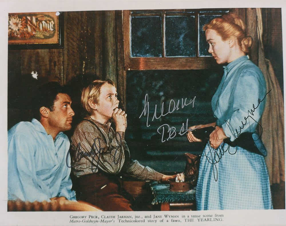Color glossy 10 x 8 photo of a promotional photo for The Yearling, signed in silver ink by Gregory Peck and in black felt tip by Claude Jarman, Jr., and Jane Wyman. Some light contrast to Jarman’s signature and small area of surface loss to top edge, otherwise fine condition.