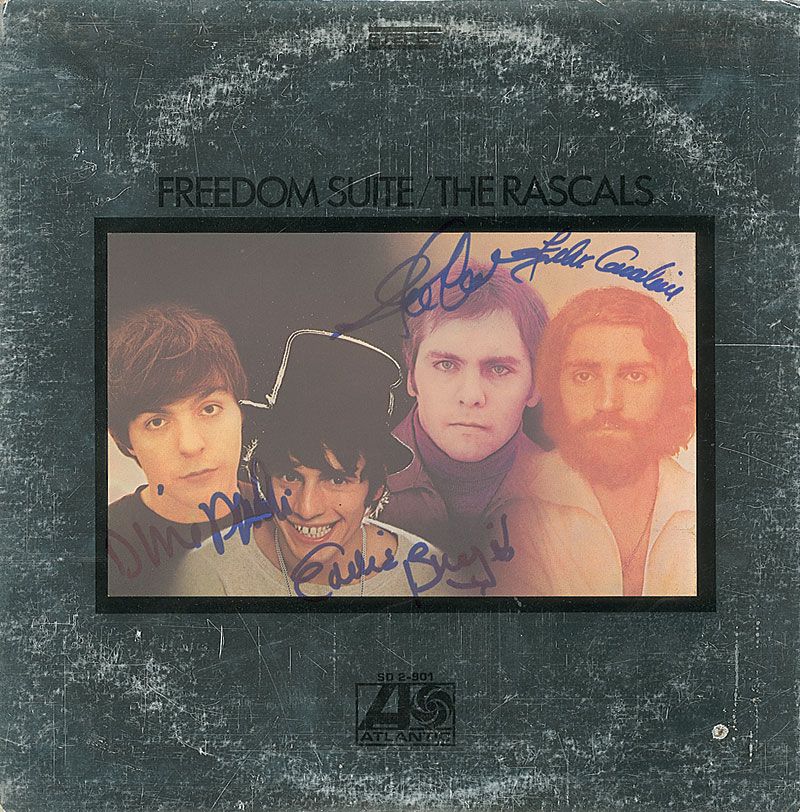 Freedom Suite album signed on the front cover in blue felt tip by Felix Cavaliere, Eddie Brigati, Dino Danelli, and Gene Cornish. Scattered wear and rubbing to covers and a punch hole to lower right going through both covers, otherwise fine condition. The record is included.