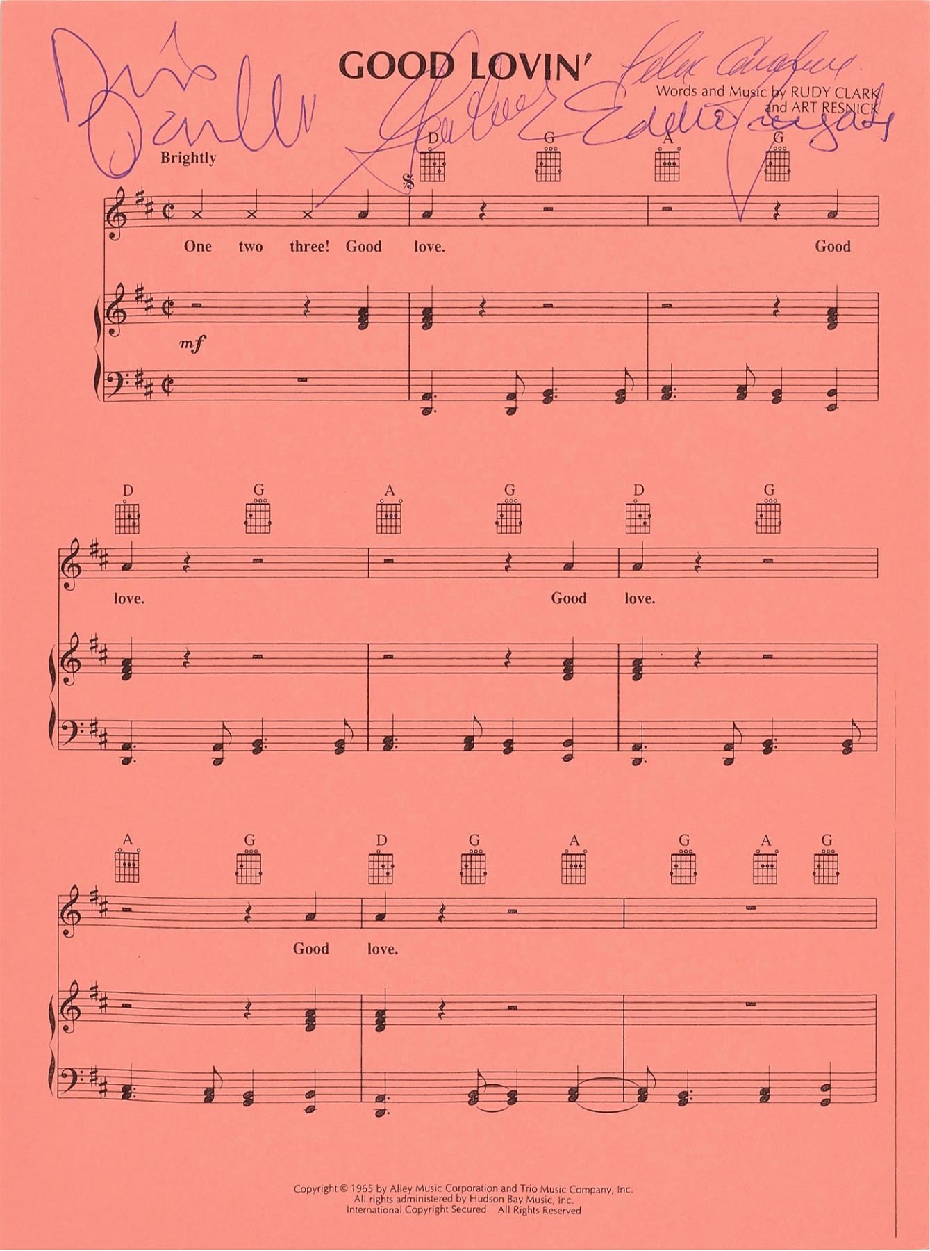 Souvenir sheet music for The Young Rascals song 'Good Lovin,' printed on a peach-colored 8.5 x 11 sheet, signed ialong the top in blue ballpoint by Felix Cavaliere, Eddie Brigati, Gene Cornish, and Dino Danelli. In very fine condition. 'Good Lovin'' was named as one of The Rock and Roll Hall of Fame's '500 Songs that Shaped Rock and Roll,' and was ranked #333 on Rolling Stone's 500 Greatest Songs of All Time list.