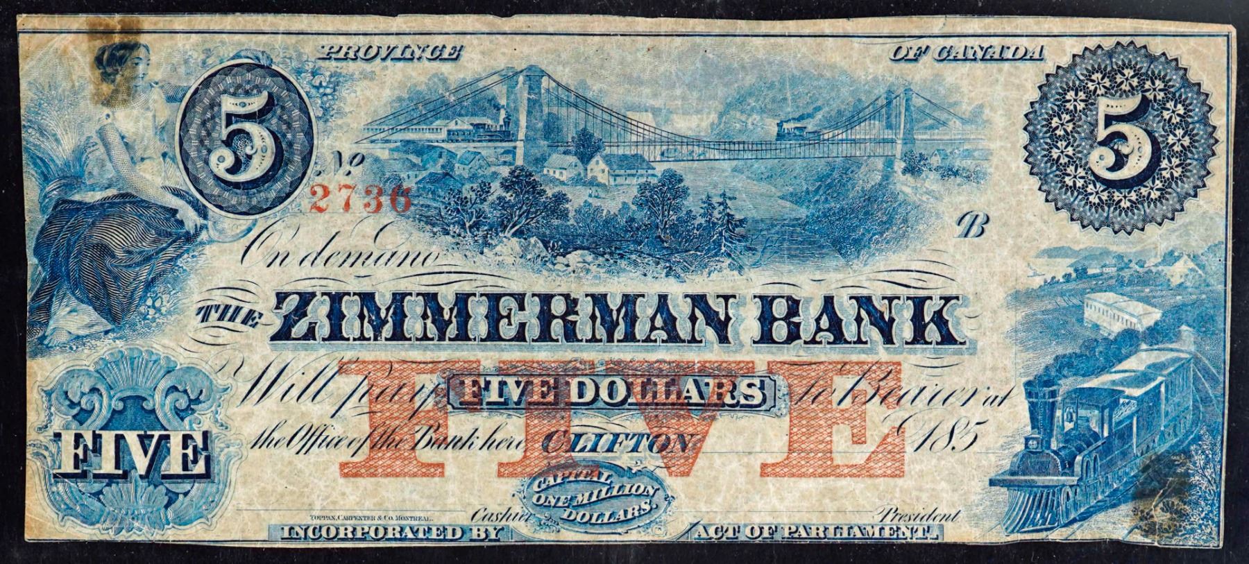 The Zimmerman Bank $5 #2736 VF or better, previously mounted.