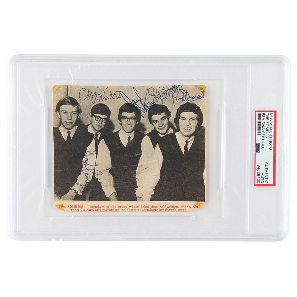 Vintage 5.25 x 4.5 group photo clipped from a magazine, signed in blue ballpoint by Colin Blunstone, Rod Argent, Paul Atkinson, Hugh Grundy, and Chris White. In fine condition, with old tape toning to clipped corners. Encapsulated in a PSA/DNA authentication holder.