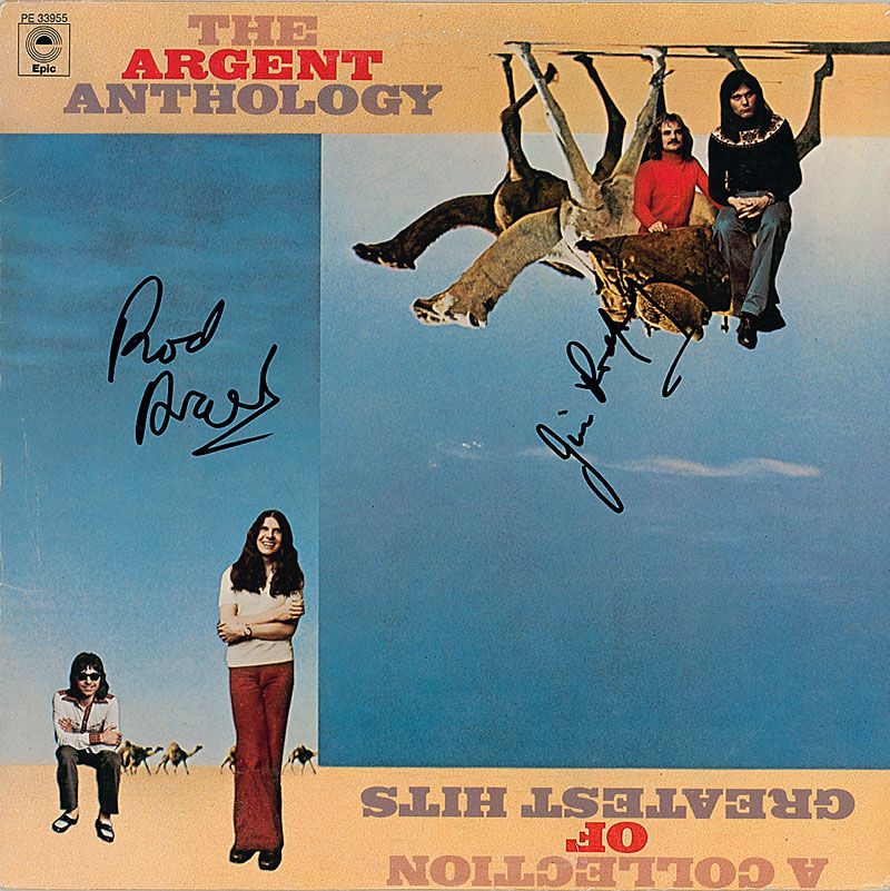 The Argent Anthology album, signed on the front cover in black felt tip by Rod Argent and Jim Rodford; and the Zombies Absolutely the Best CD, signed on the front cover of the booklet in black felt tip by Argent and Colin Blunstone. In fine condition, with some light creases and album impression to record cover. The records and CD are included.