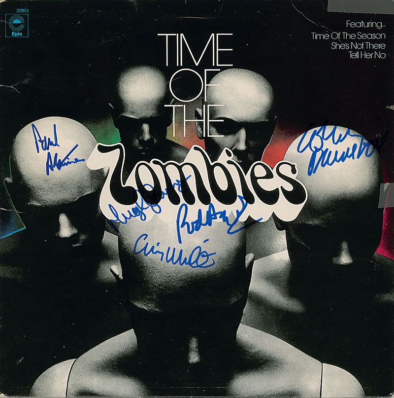 Time of the Zombies album signed on the front cover in blue felt tip by Colin Blunstone, Paul Atkinson, Rod Argent, Hugh Grundy, and Chris White. In fine condition, with a partial separation to bottom edge and a couple small edge creases. The record is included.