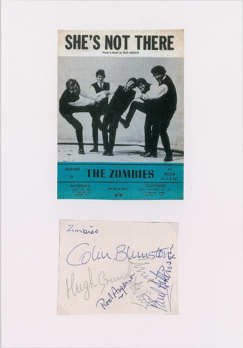 Ballpoint and pencil signatures of Colin Blunstone, Rod Argent, Paul Atkinson, Hugh Grundy, and Chris White on an off-white 3.75 x 3 slip, with one adding “Zombies.” Removably mounted to an off-white 8 x 11.25 cardstock sheet with an affixed image of the band’s ‘She’s Not There’ promo. In fine condition.