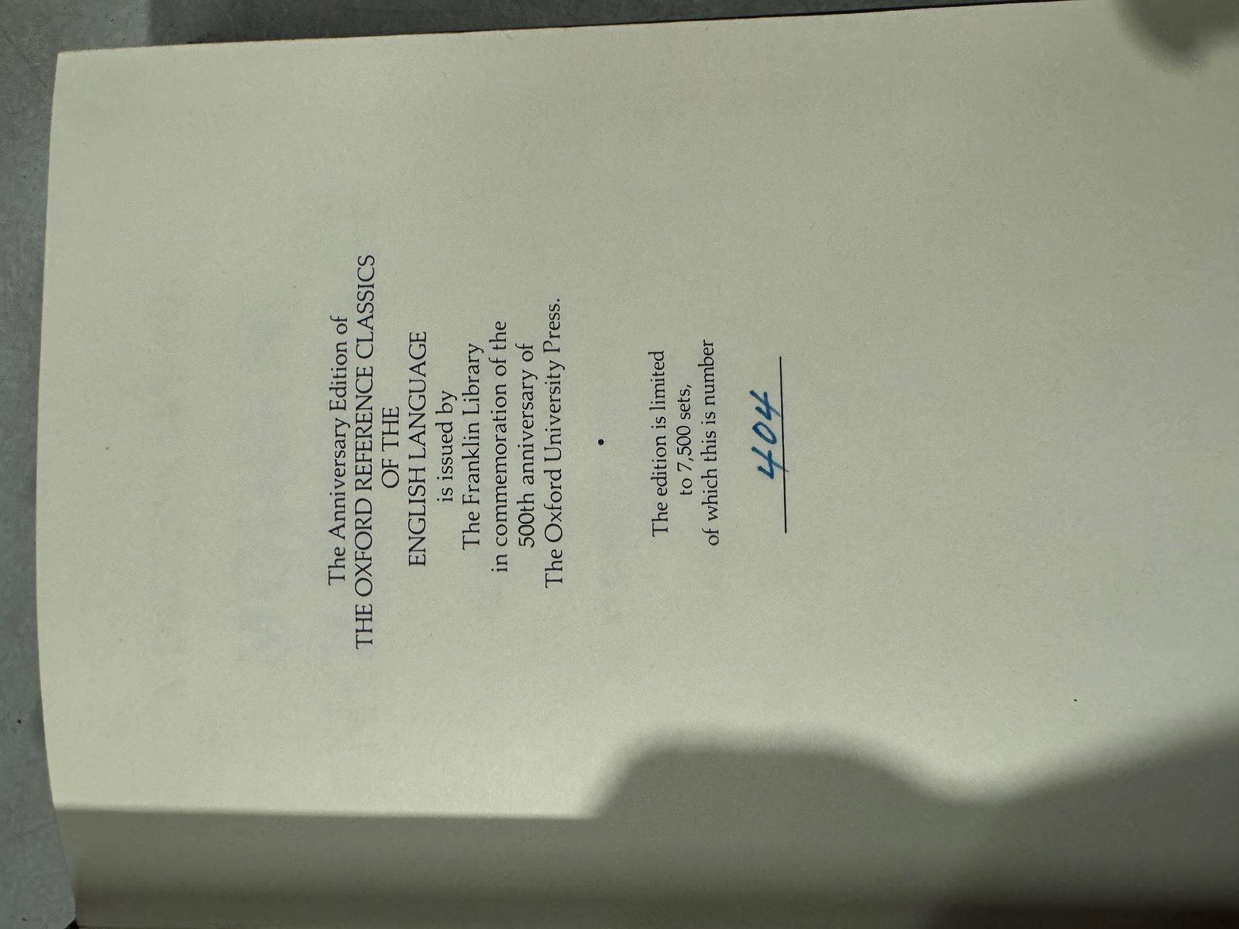 The anniversary edition, the Oxford reference classics of the English language issued by the Franklin library in commemoration of the 500th anniversary of the Oxford university press number 404 of 7500 sets