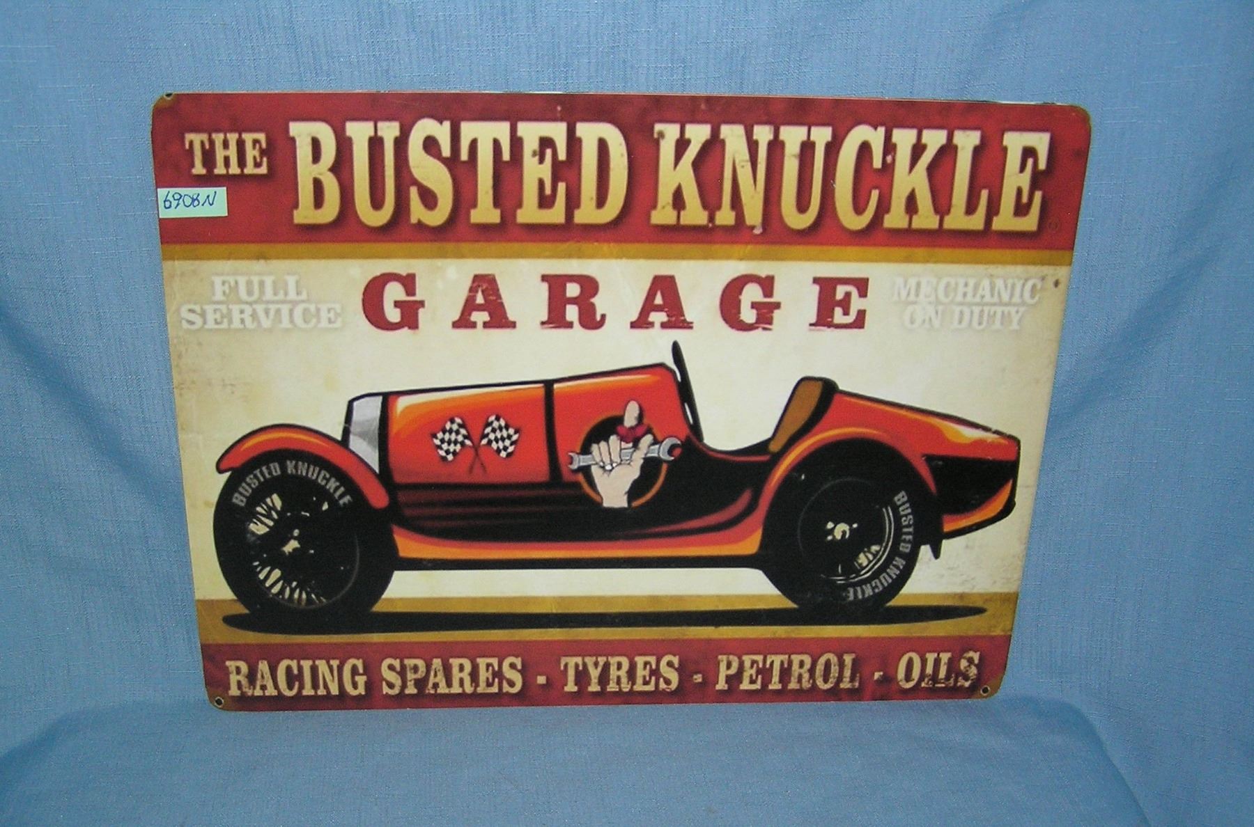The busted knuckle garage retro style advertising sign printed on PVC hardboard these signs are auctioned for their decorative and display purposes 12 inches by 16 inches est. value $40.00-$50.00