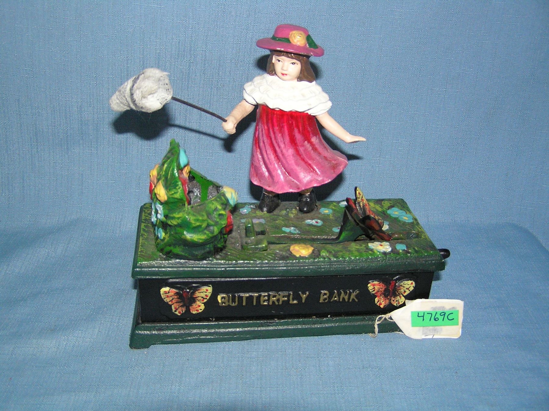 The butterfly cast iron mechanical bank beatuiful hand painted modern bank est. value $300.00-$350.00