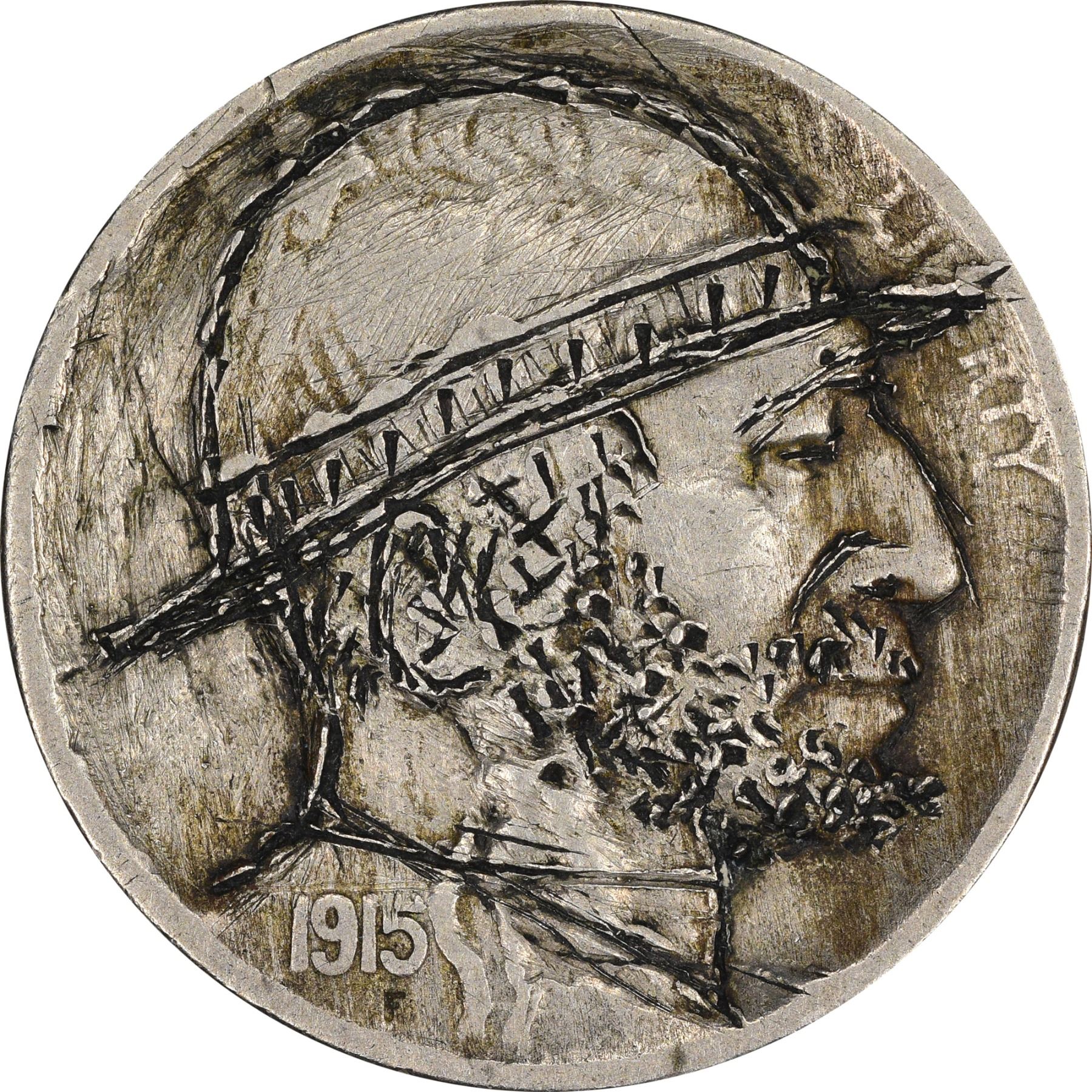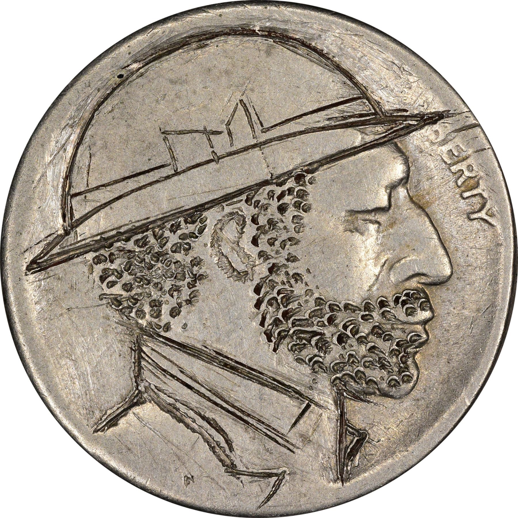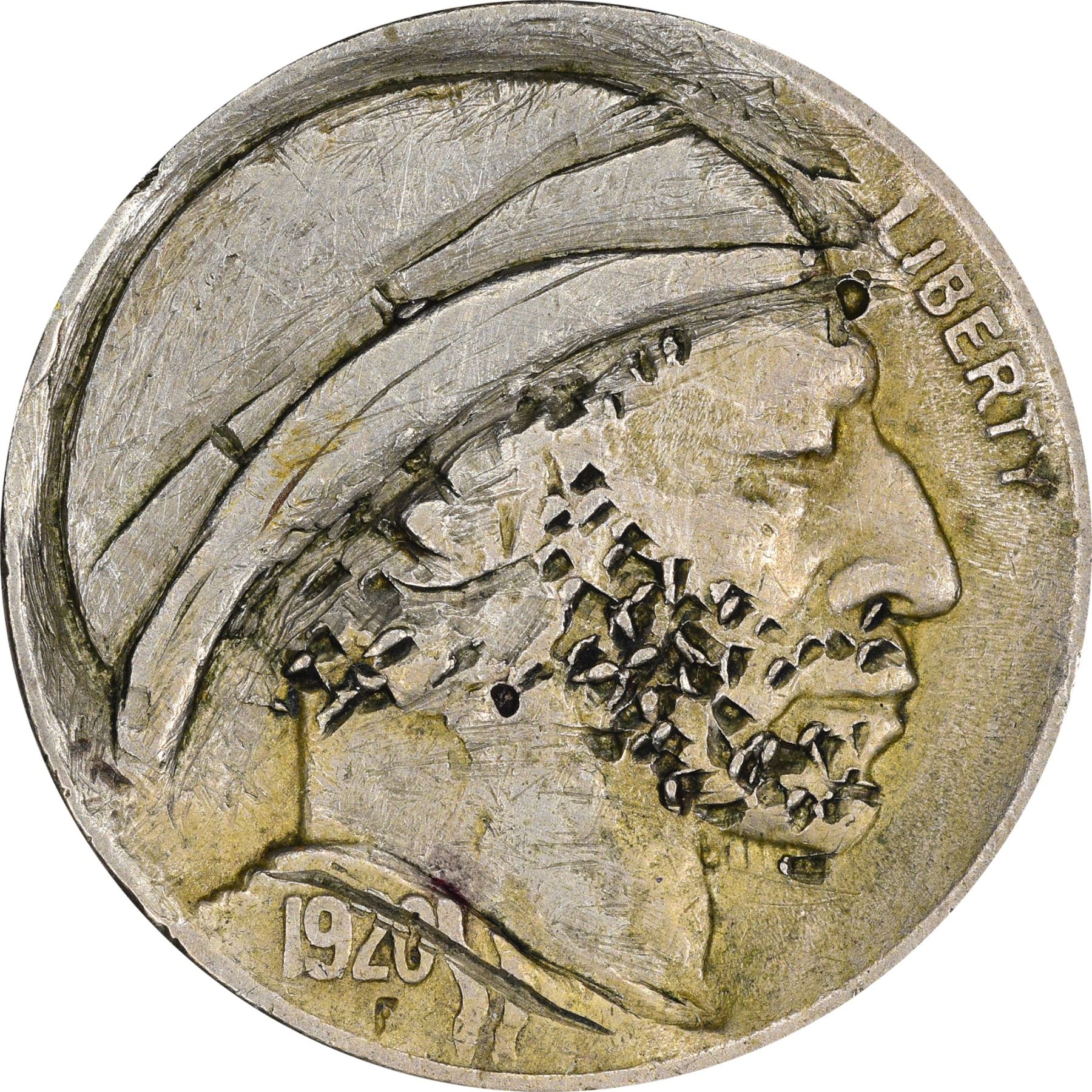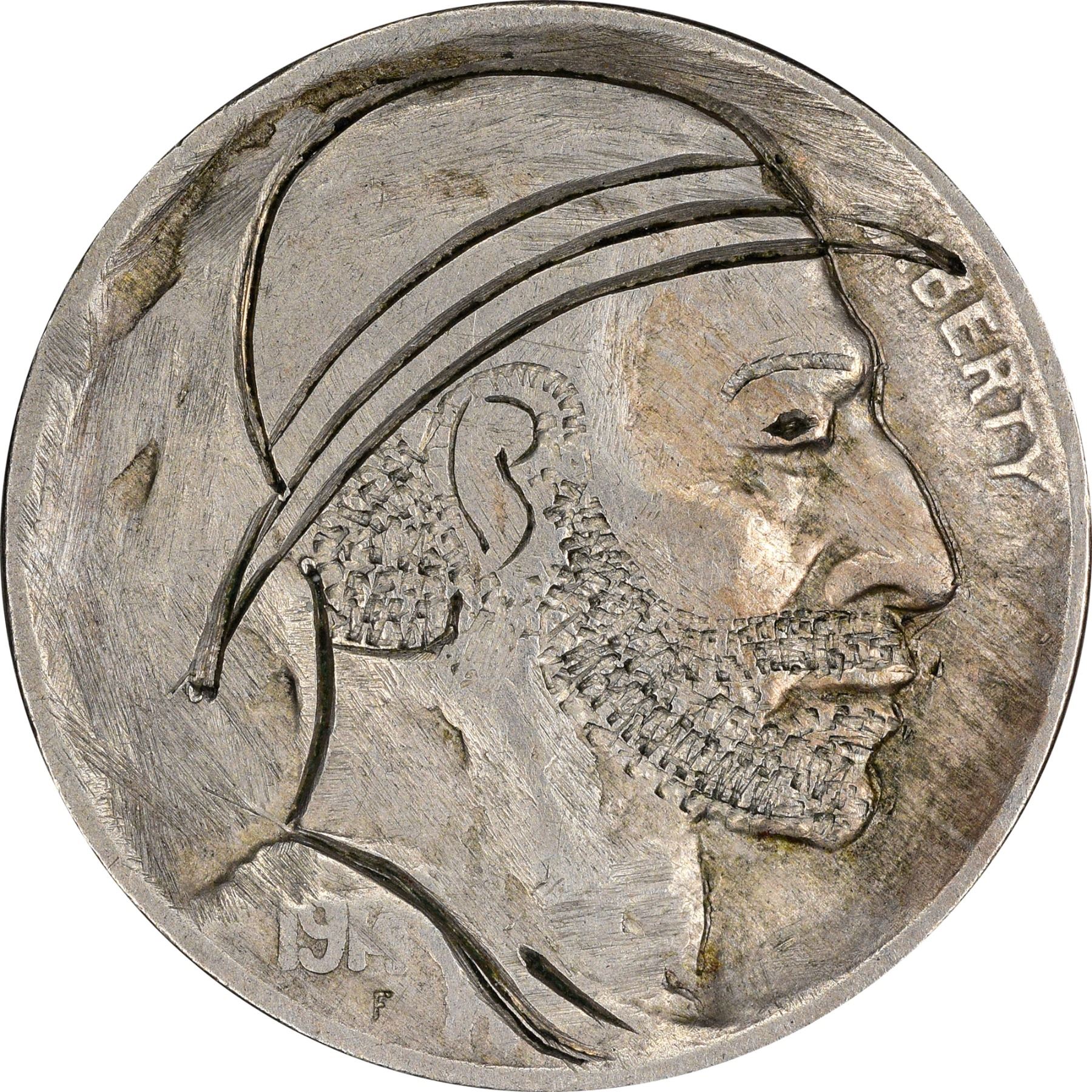 The carvings have been done using a variety of techniques exemplifying traditional hobo nickel subje