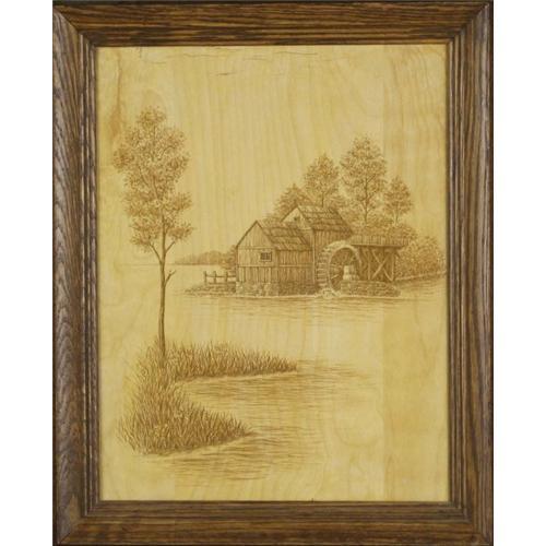 This print on wood is a very unique piece. It is full of well rendered details and displays a mastery of technique. The etching is varnished for long lasting protection of the image and is framed in a dark stained wood frame that matches the dark colors of the etching, helping it stand out from its background. The entire piece measures 21? x 17?.