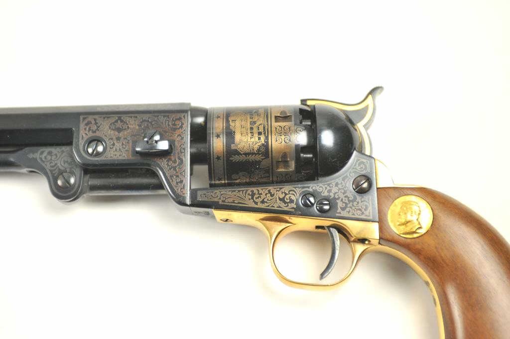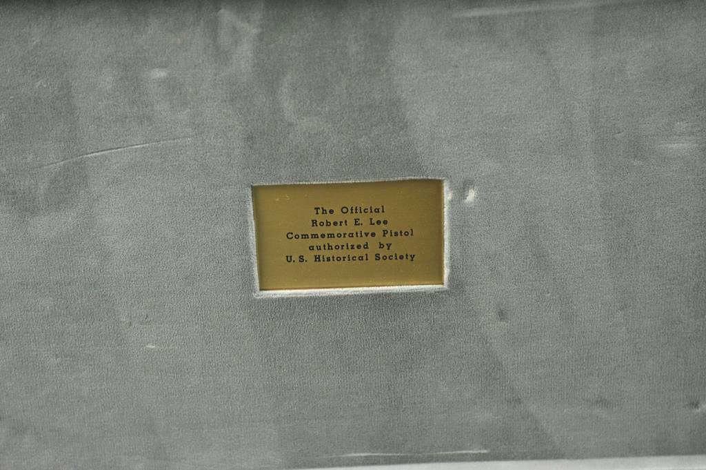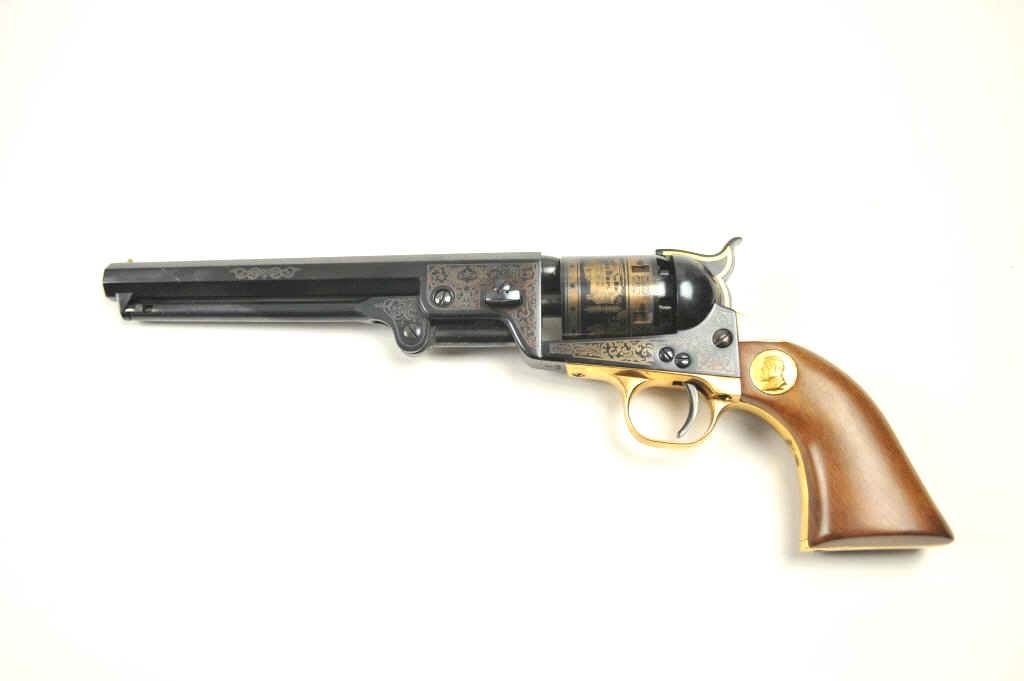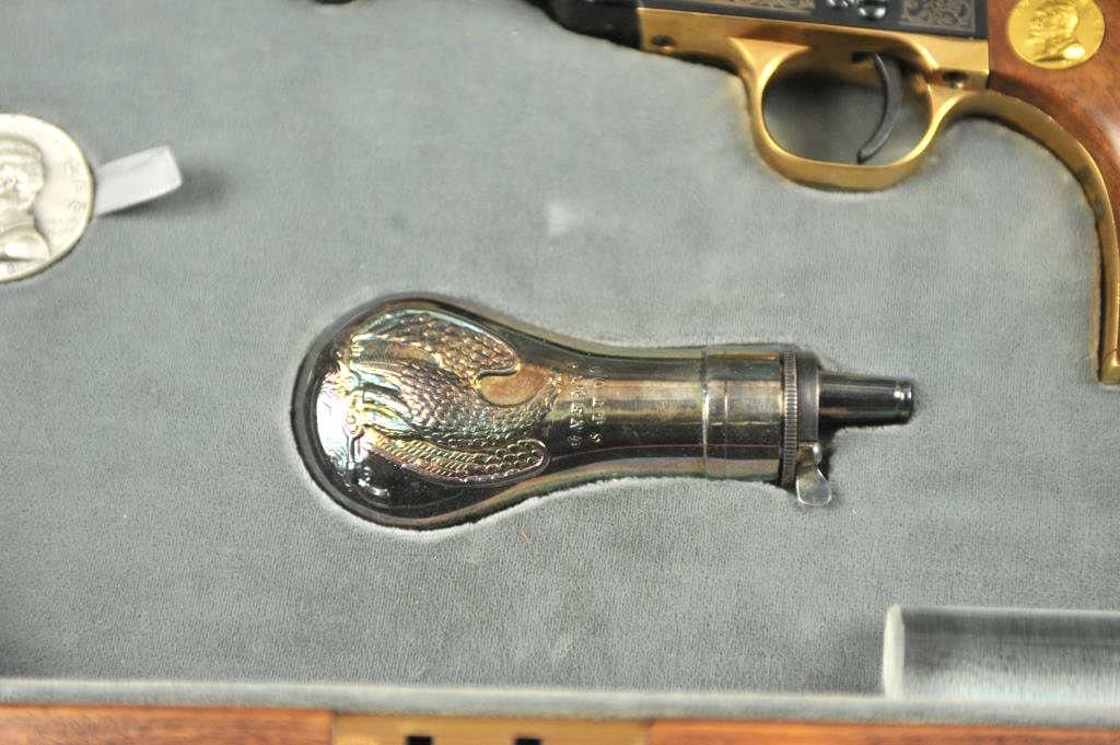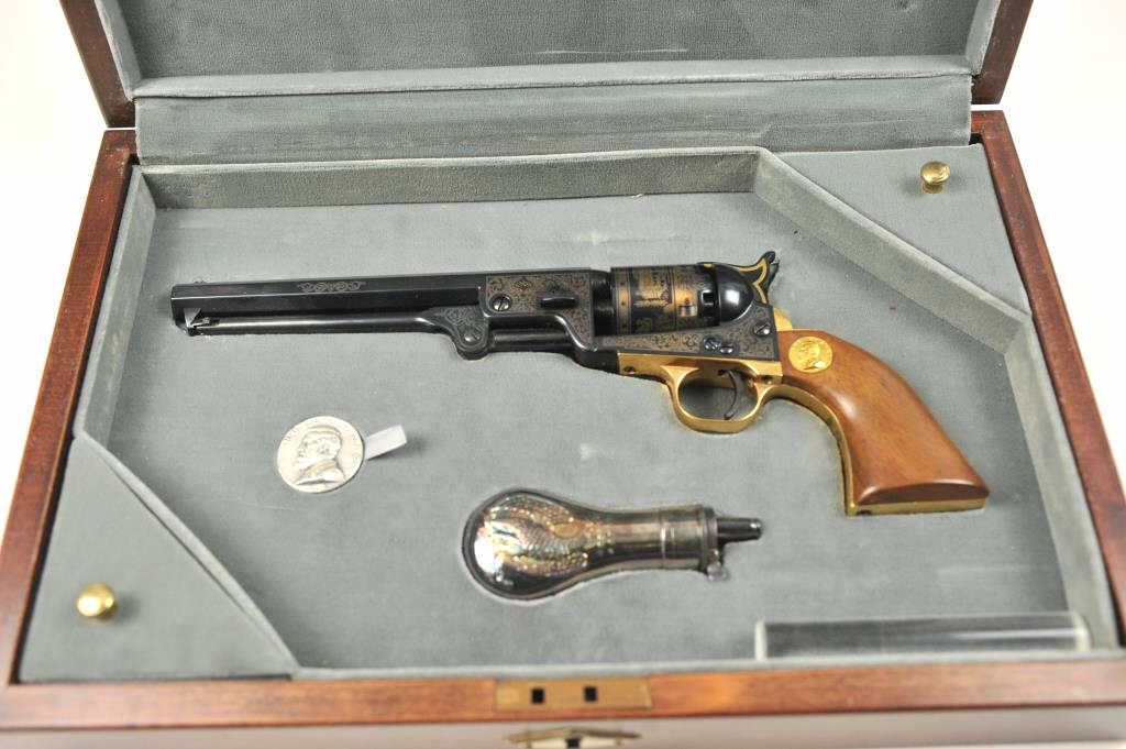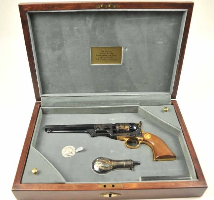 The official Grant and Lee commemorative Navy revolver with gold decorations and presentation display case in excellent condition. Issued by U.S. Historical Society #1409. Mint in box with medallion and eagleflask. A great Christmas gift for the Civil War history buff. Est.: $600-$1200