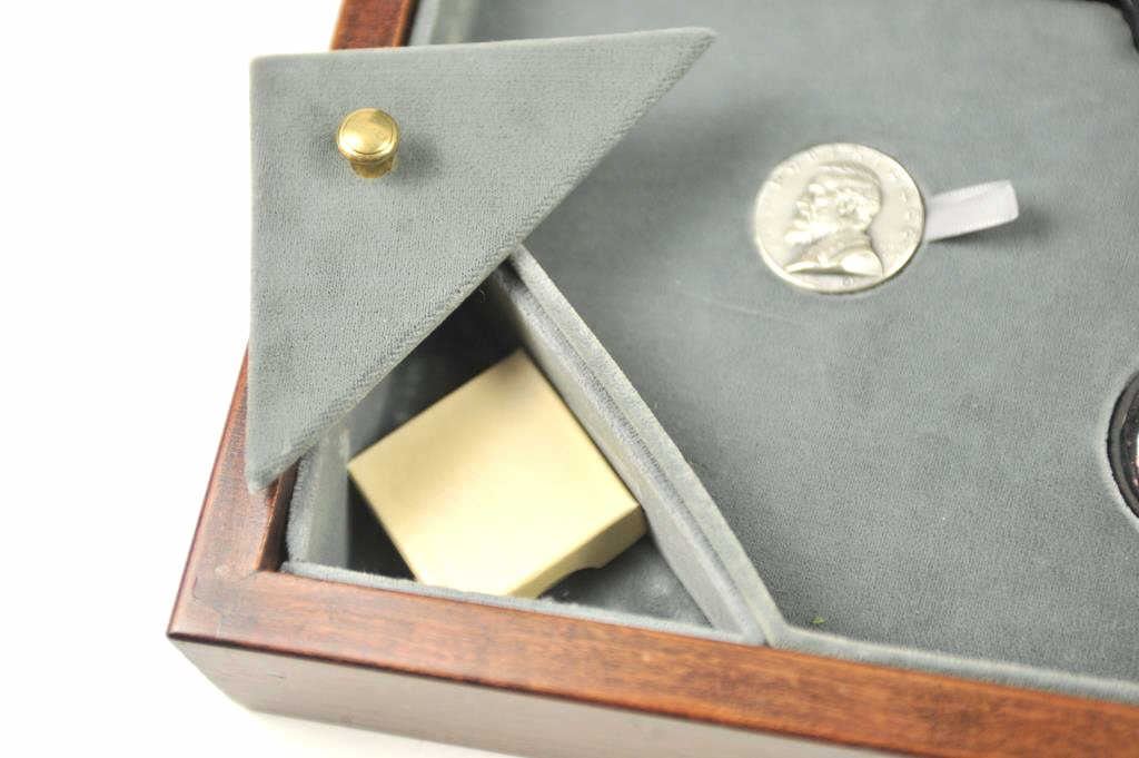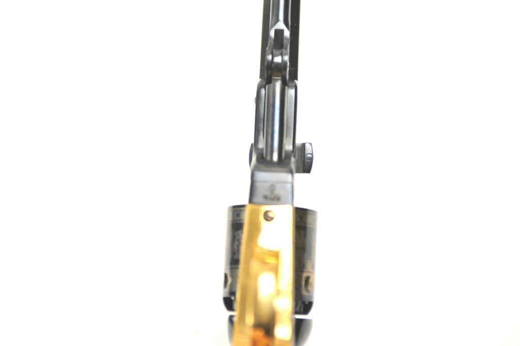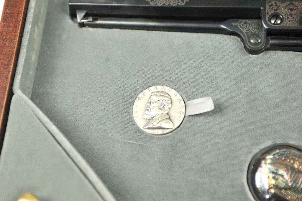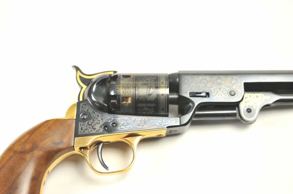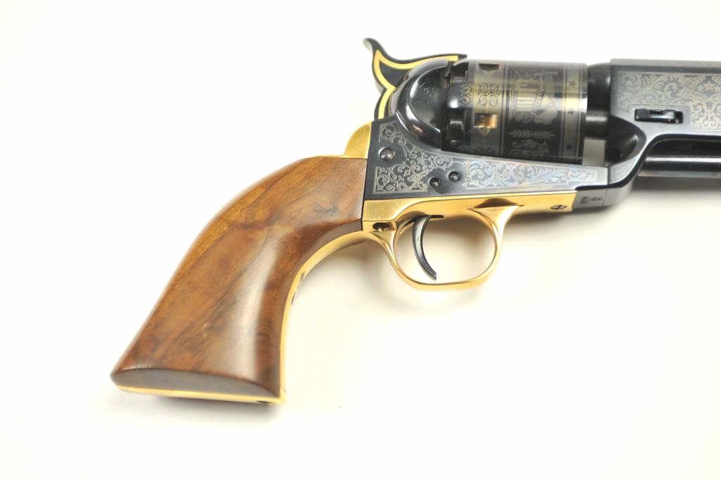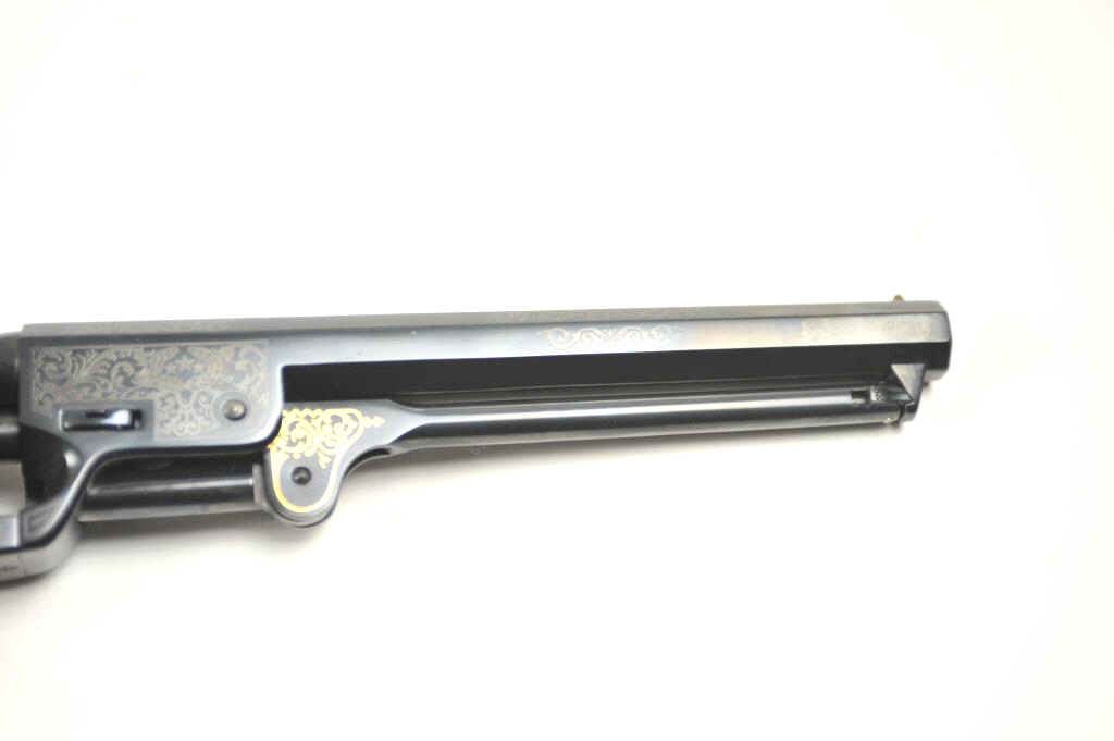 The official Grant and Lee commemorative Navy revolver with gold decorations and presentation display case in excellent condition. Issued by U.S. Historical Society #1409. Mint in box with medallion and eagleflask. A great Christmas gift for the Civil War history buff. Est.: $600-$1200