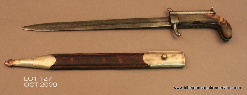 The only known example of a double barrel percussion knife pistol with original scabbard, circa 1860, 9mm cal., 4-1/2” barrels, 15” blade, 23” overall. This extremely rare oddity is in overall very good condition showing a pleasingconsistent light patina on all metal surfaces with scattered areas of erosion and pin prick pitting; folding triggers, working action, tastefully engraved guard, horn grips that are good overall with minor scratches and mars to surfaces, verygood leather scabbard with metal throat and tip. A truly one-of-a-kind piece worthy of a museum display or center piece for a serious collector’s gunroom. Est.: $17,500-$35,000.