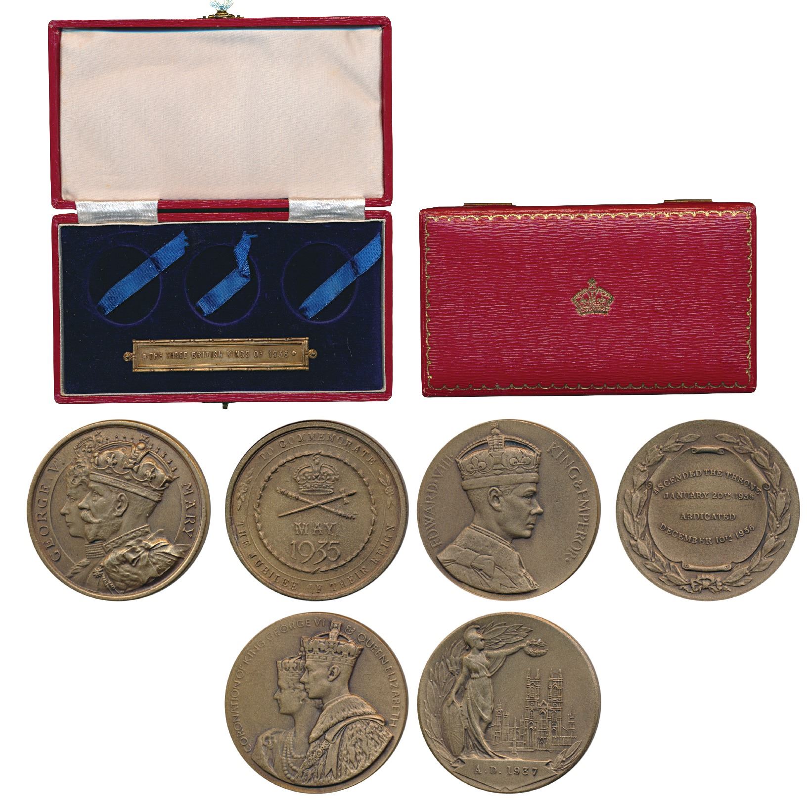 The reign of three Kings in 1936, Copper Medal (Small size) (3), a notable year in English History when 3 kings reigned in the same year, commemorated by three medals in a box. Silver Jubilee of King George V and Queen Marry, conjoined busts of the rulers on obv., 1935; The Abdication of Edward VIII, portrait of the ruler to right obv., Ascended the Throne Jan 20th / Abdicated Dec 10th 1936 within wreath; The Accession of King George VI and Queen Elizabeth, 1937, Britannia holding shield rested on floor holding a floral wreath and Westminster Abbey in the background. Mint State, In original box of issue. (3) King George V died on January 20, 1936. King Edward VIII abdicated on December 10 and King George VI ascended the throne on December 11 1936.