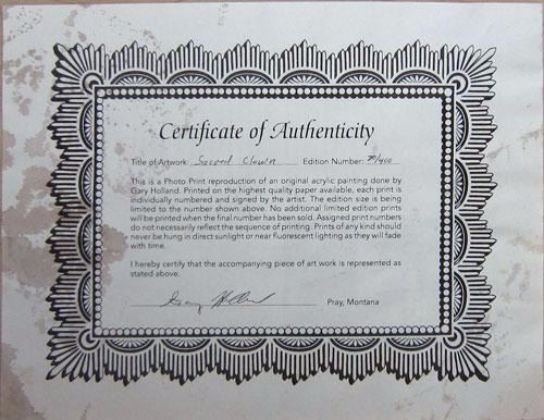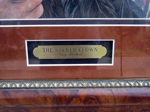 The sacred clown limited edition photo print limited to only 400, this is a photo print reproduction of an original acrylic painting done by Gary Holland. Printed on the highest quality paper available, each print is individually numbered and signed by the artist. The edition size is being limited to the number shown above. No additional limited edition prints will be printed when the final number has been sold. Assigned print numbers do not necessarily reflect the sequence of printing. Prints of any kind should never be hung in direct sunlight or near fluorescent lighting as they will fade with time. Size: 29X25 inches.