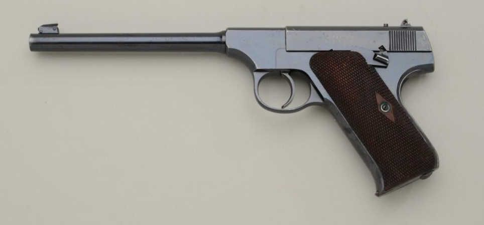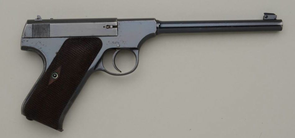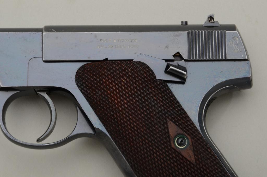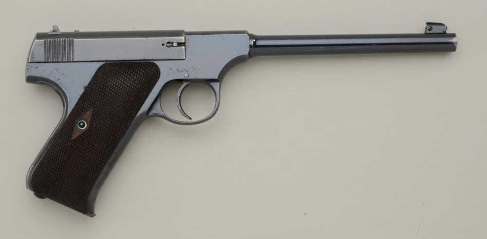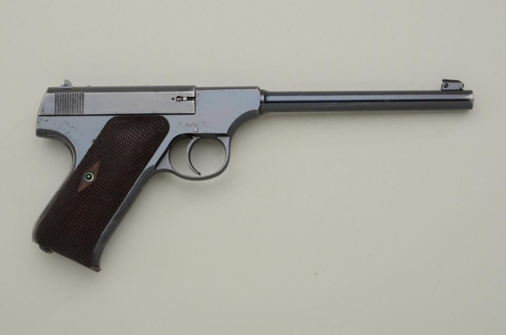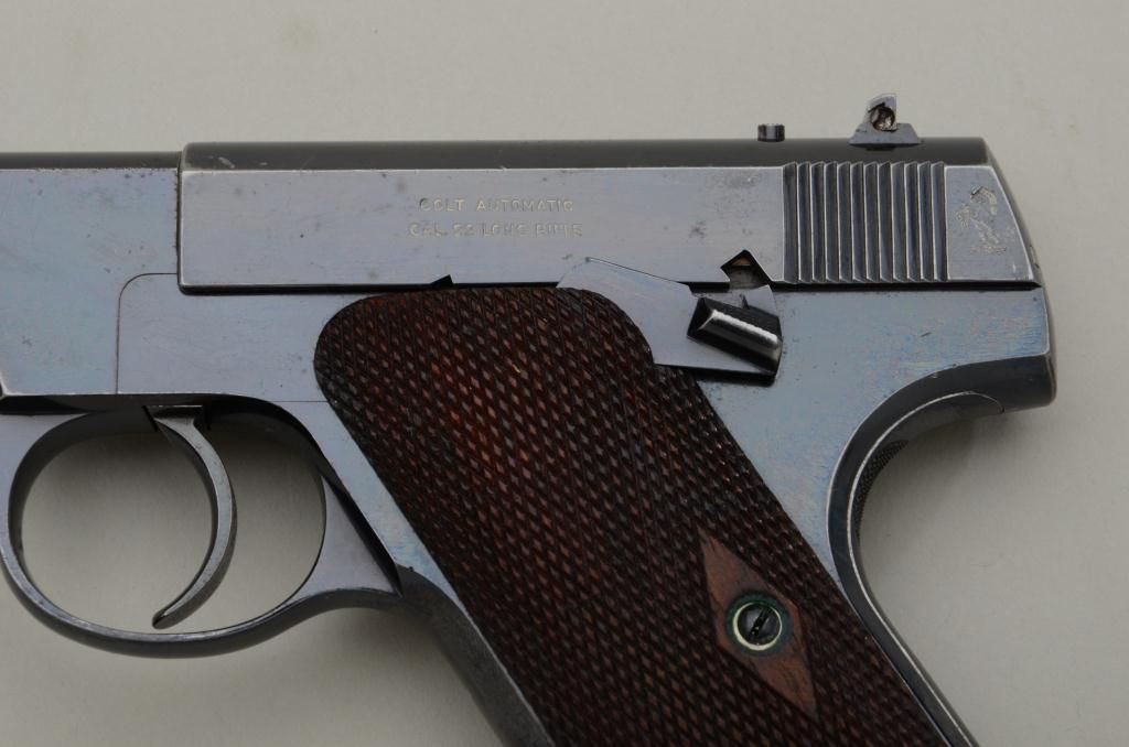The ultimate in Colt collecting is obtaining a serial number 1 in virtually any pre-war model. Serial number 1 Texas Patterson was the 1st Colt pistol we know to break the $1,000,000 mark in the mid-1990s. Serialnumber 1 Colt Single Action Army recently changed hands in nearly the same range. We are proud to offer for sale serial number 1 Colt Woodsman Model semi-automatic pistol pictured in the “Book Of Colt Firearms” bySutherland and Wilson on page number 457. Wilson mentions the placement of the serial number which is directly under the guard and farther up the strap then normal. This Colt remains in very good plus to near fineoriginal condition with 85% to 95% original mirror bright blue finish with some minor scratches and slight wear at the edges probably from handling and testing. The grips are very good with slight edge wear also.The interior is also very good showing some use wear and was probably used as a test gun by John M. Browning and the factory. A very interesting and unusual unmarked clip is included with a blued bottom and engine