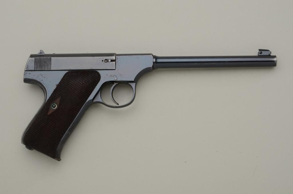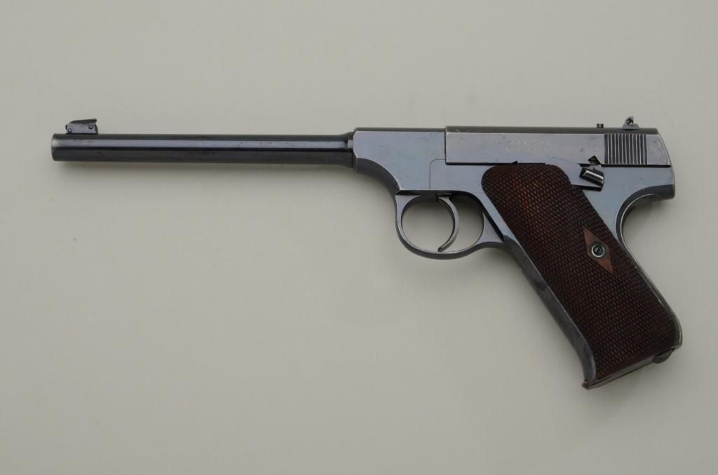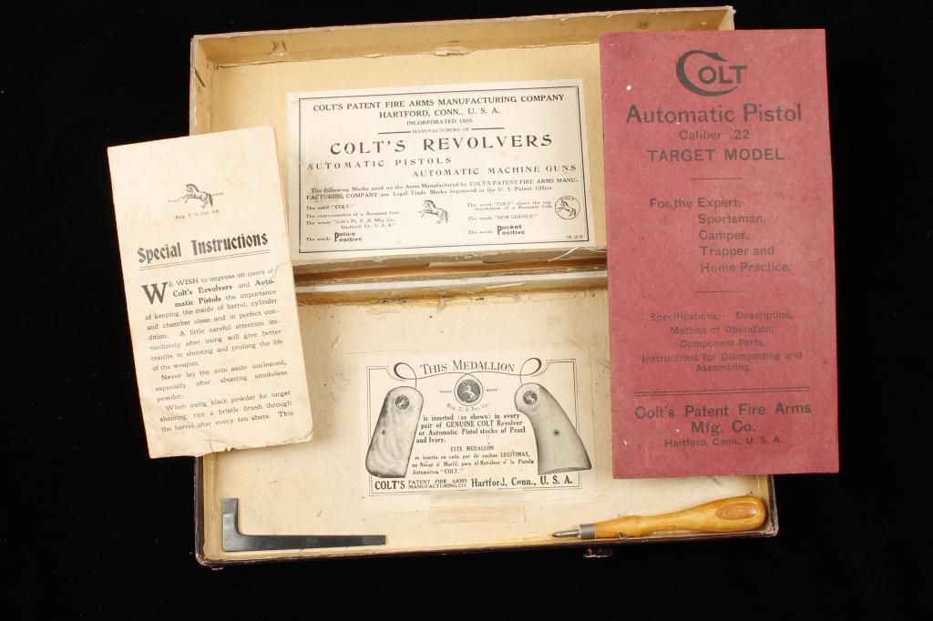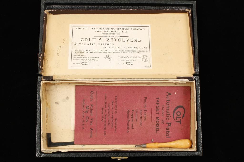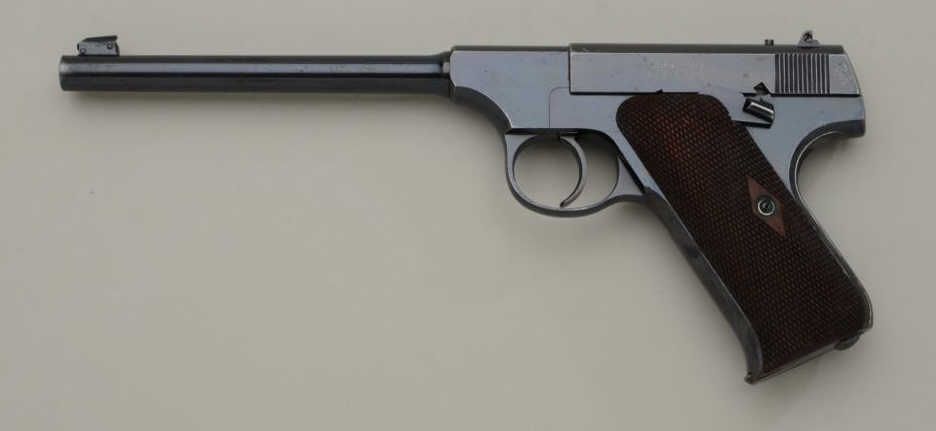 The ultimate in Colt collecting is obtaining a serial number 1 in virtually any pre-war model. Serial number 1 Texas Patterson was the 1st Colt pistol we know to break the $1,000,000 mark in the mid-1990s. Serialnumber 1 Colt Single Action Army recently changed hands in nearly the same range. We are proud to offer for sale serial number 1 Colt Woodsman Model semi-automatic pistol pictured in the “Book Of Colt Firearms” bySutherland and Wilson on page number 457. Wilson mentions the placement of the serial number which is directly under the guard and farther up the strap then normal. This Colt remains in very good plus to near fineoriginal condition with 85% to 95% original mirror bright blue finish with some minor scratches and slight wear at the edges probably from handling and testing. The grips are very good with slight edge wear also.The interior is also very good showing some use wear and was probably used as a test gun by John M. Browning and the factory. A very interesting and unusual unmarked clip is included with a blued bottom and engine