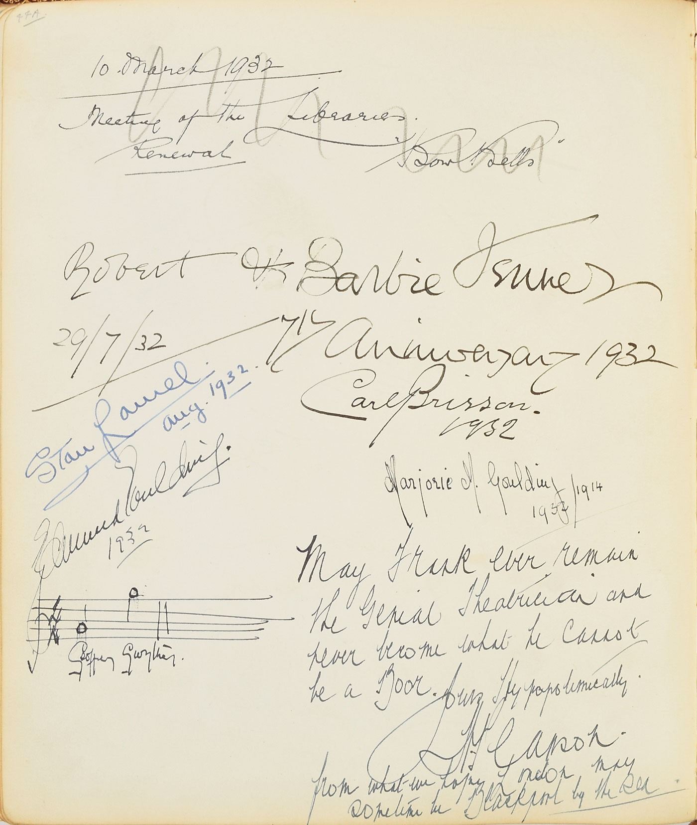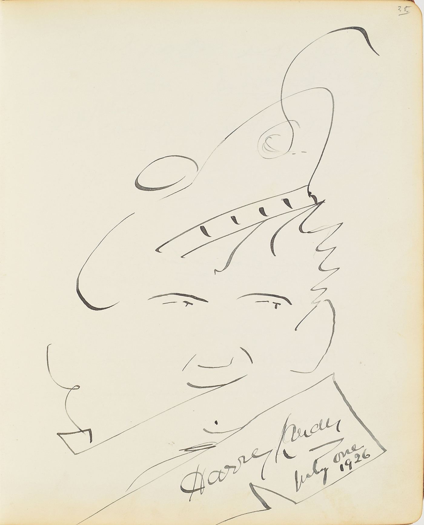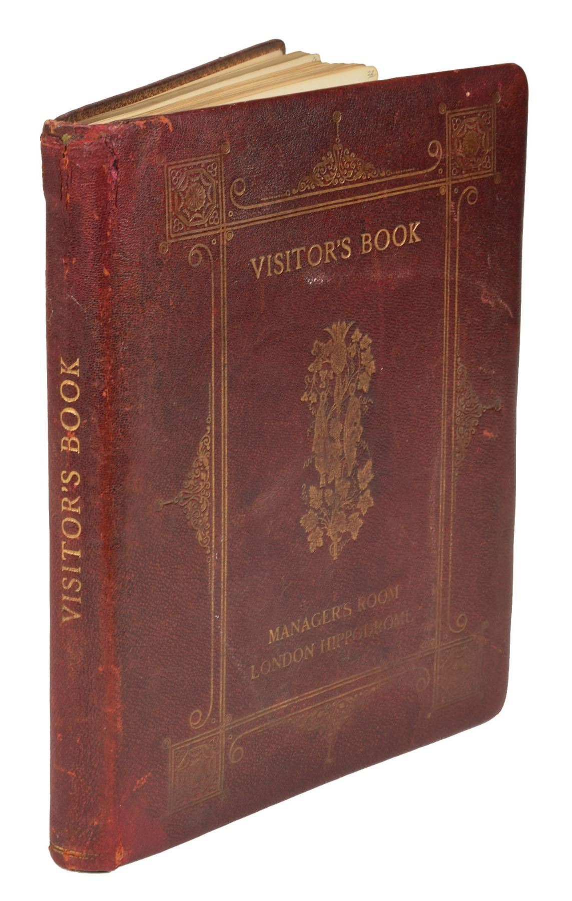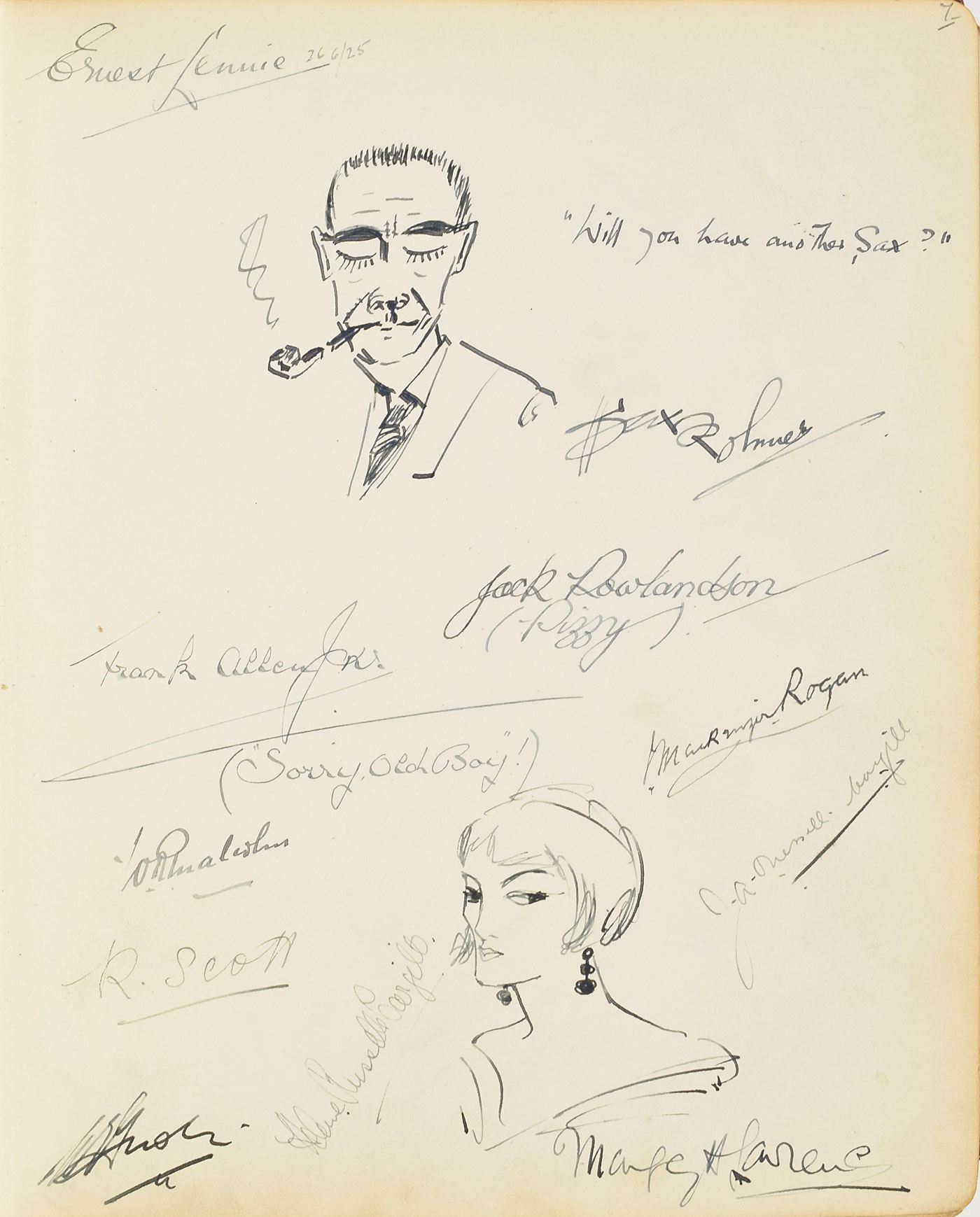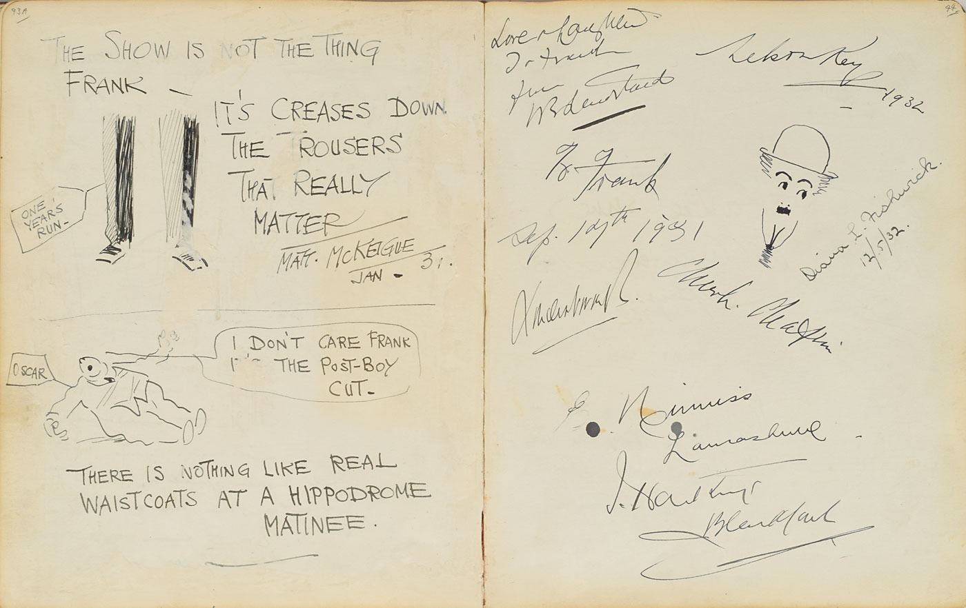 Impressive leatherbound visitor's autograph book from the manager's office of the London Hippodrome, 8.25 x 10.25, containing several hundred mostly theatrical autographs from circa 1924–1940, signed on both sides of 54 leaves. Highlights include: a signed self-portrait sketch by Charlie Chaplin of his instantly recognizable 'Little Tramp' character; a signed self-portrait sketch by Dr. Fu Manchu creator Sax Rohmer, adding, "Will you have another, Sax?"; a full-page signed self-portrait by Harry Lauder; an AMQS by Scottish composer Sir Alexander Campbell Mackenzie, from "Benedictus"; and signatures of Stan Laurel, Edmund Gwenn, Paul Whiteman, Irving Caesar, Bebe Daniels, Ben Lyon, Ted Lewis, Benno Moiseiwitsch, Sigmund Romberg, Gene Sarazen, Edna Goodrich, George Robey, Herman Finck, Tom Webster, Hughie Green, Margaret Bannerman, Edward Sylvester Hynes, Leslie Henson, John Hassall, Edgar Wallace, Jack Hylton, Lupino Lane, Billy Bennett, seven members of the Australian cricket team, Fred Terry, C.B. Cochran, Betty Balfour, Alex Herd, Henry Cotton, Harry Nichols, K.S. Duleepsinhji, A.H.H. Gilligan, Herbert Chapman, Carol Brisson, and many others. The front of the book is ornately gilt-stamped, "Visitor's Book, Manager's Room, London Hippodrome." In fine condition, with wear to the covers and a few old repairs to the loose hinge; interior pages are all clean. Interestingly, the first show ever given at the London Hippodrome, in January 1900, was a music hall revue entitled 'Giddy Ostend' with Charlie Chaplin, as a child, in one of his very first roles. By 1932 he was an internationally recognized film star, and he had returned to London for his 1931 film City Lights.