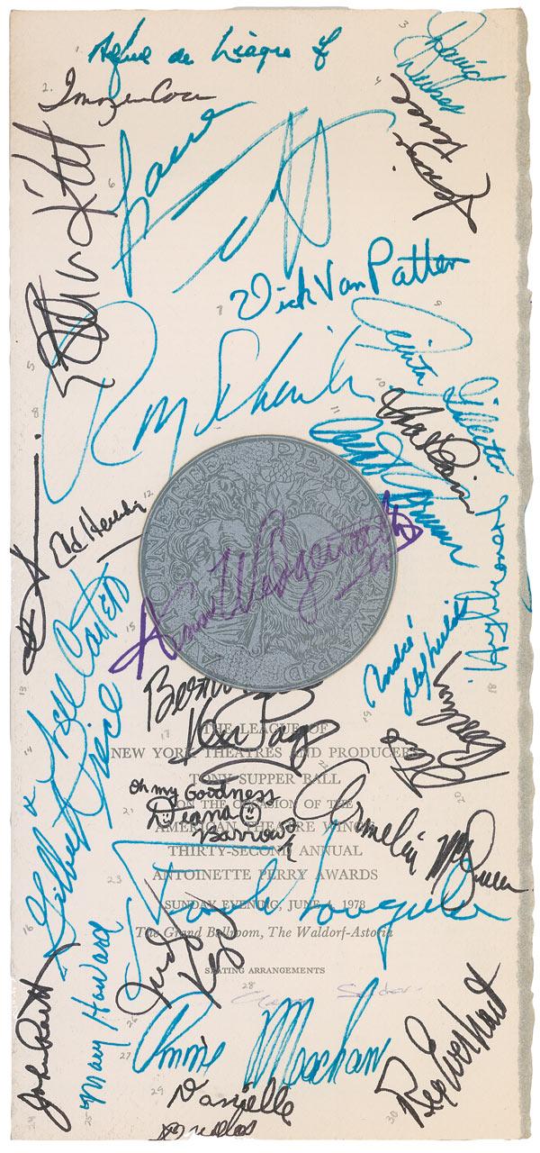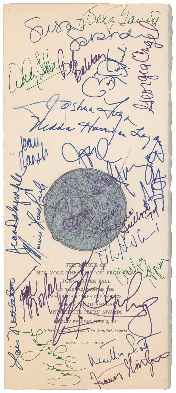 Two League of New York Theatres and Producers Tony Awards Dinner programs, 6.5 x 13.25. one from 1978 and one from 1979, each signed on its front cover by more than two dozen (mostly different on each) celebrities in various ink types and colors. Signers include: Imogene Coca, David Dukes, Eartha Kitt, Lorna Luft (2), Dick Van Patten, Roy Scheider, Cliff Gorman, Nell Carter, Amelia McQueen, Frank Langella, John Raitt, Judy Kaye, Anne Meecham, Danielle Brisbois, Jean Marsh, Joshua Logan, Nedda Harrigan Logan, Betty Garrett, and Susan Sarandon. In overall fine condition, with handling wear to both, tiny numerical pencil notations next to each star on the 1978 menu, and uniform toning to the 1979 menu.